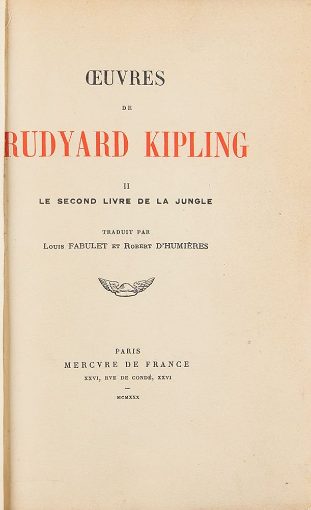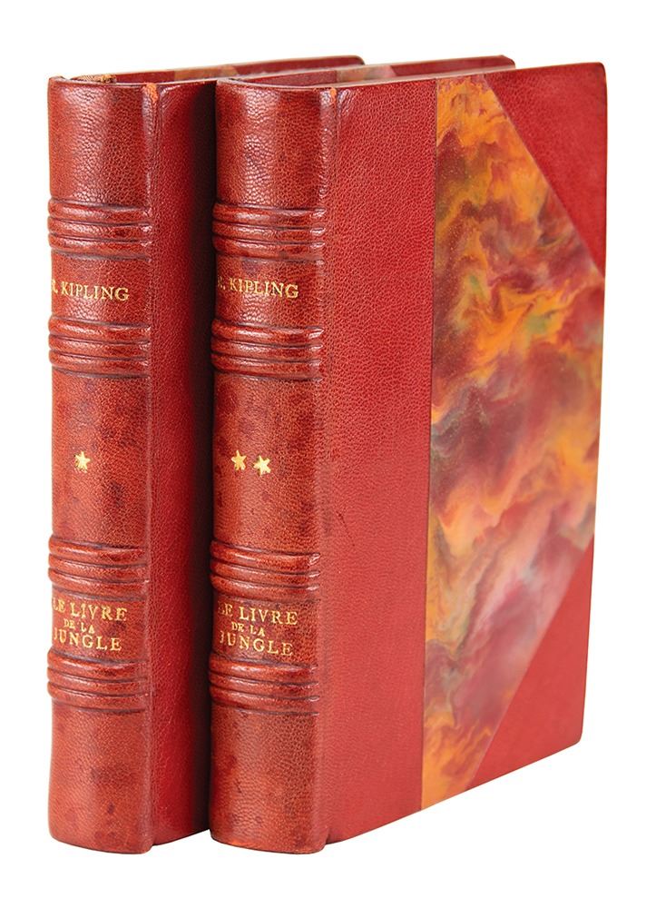 Two unsigned French-language books published in Paris by Mercure de France in a series entitled ‘Works of Rudyard Kipling’--The Jungle Book (1934) and The Second Jungle Book (1930). Both hardcover, three-quarter-bound with red leather, raised band spine with gilt lettering, and marbled endpapers, 5.5 x 8, 314 pages and 396 pages. Book condition: VG/None.