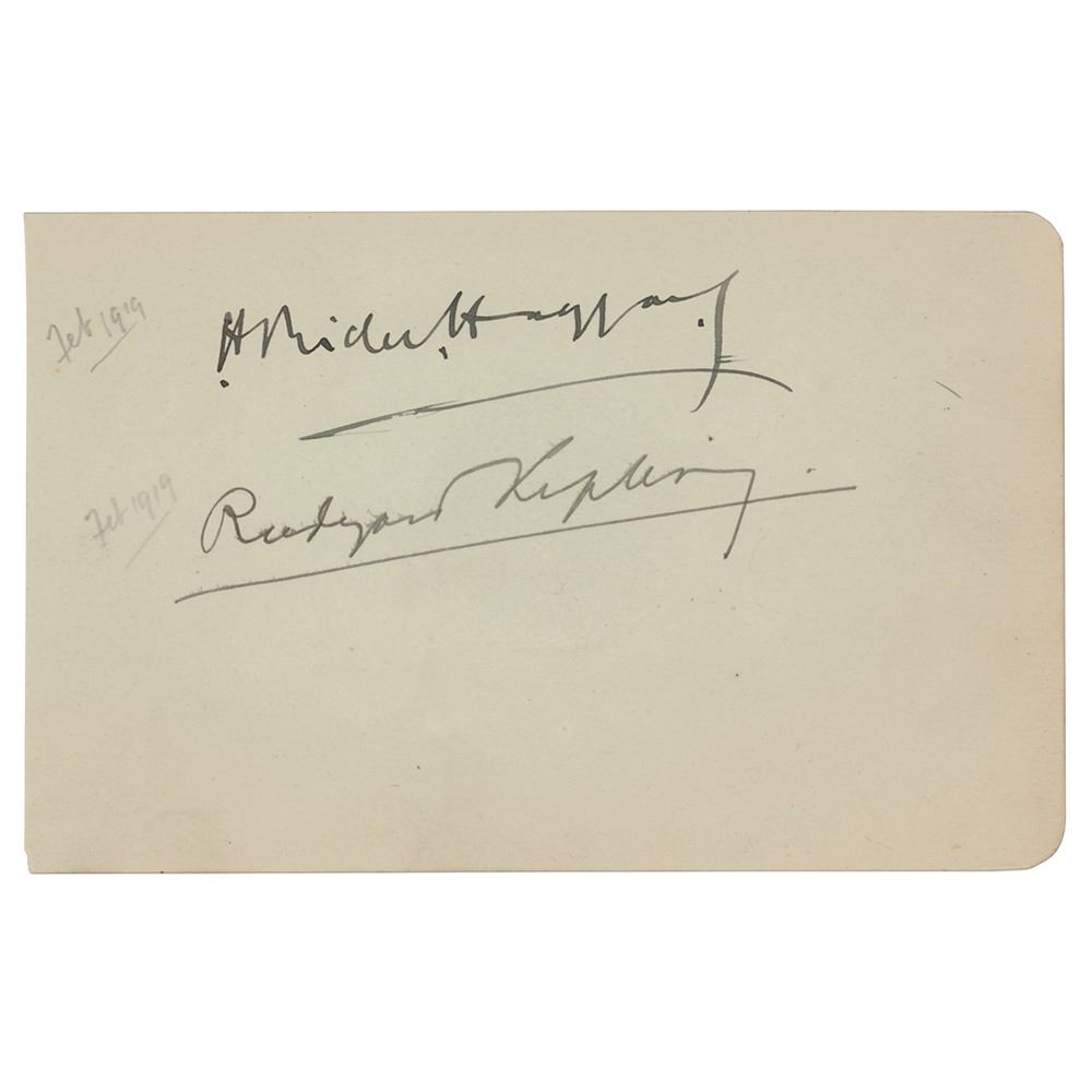 Fountain pen signatures on Rudyard Kipling and H. Rider Haggard on an off-white 6 x 3.75 album page, with pencil notations dating them both to February 1919. Reverse bears a Tyler Kipling Collection seal. In fine condition.