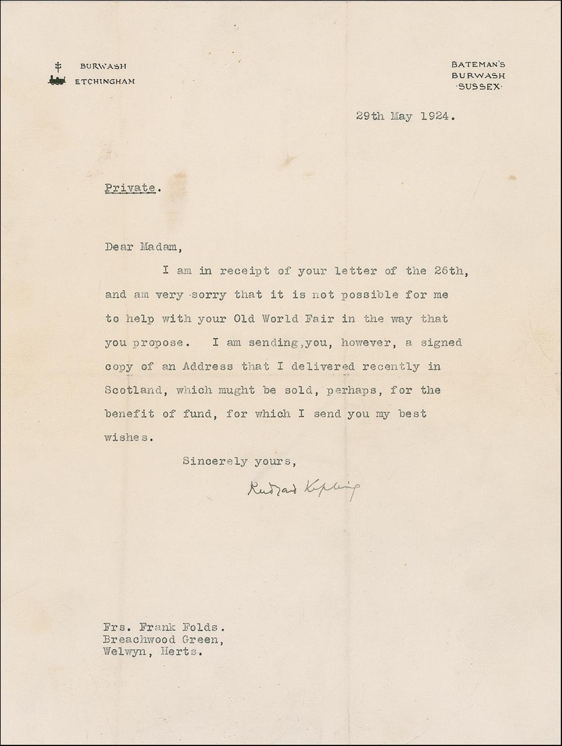 TLS, one page, 8 x 10.5, May 29, 1924. Kipling is forced to decline an invitation. In full: “I am in receipt of your letter of the 26th, and am very sorry that it is not possible for me to help with your Old World Fair in the way that you propose. I am sending you, however, a signed copy of an Address that I delivered recently in Scotland, which mught [sic] be sold, perhaps, for the benefit of fund, for which I send you my best wishes.” In fine condition, with creasing, intersecting folds (a vertical touching the end of his name), and a few spots of soiling. A fine example of Kipling’s attempt to satisfy the many requests on his time.