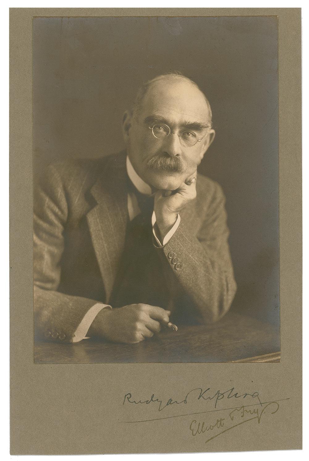 Nobel Prize–winning British author (1865–1936) best known for such colorful classics as Just So Stories, Captains Courageous, and The Jungle Book. Vintage matte-finish 4 x 5.5 Elliott and Fry portrait of a pensive Kipling resting his head on his hand affixed to an original 4.75 x 7.25 mount, signed in fountain pen on the mount, “Rudyard Kipling.” In fine condition, with mild silvering to the darker portions and Kipling’s underscore touching the top to the studio’s printed name. A very attractive pose.