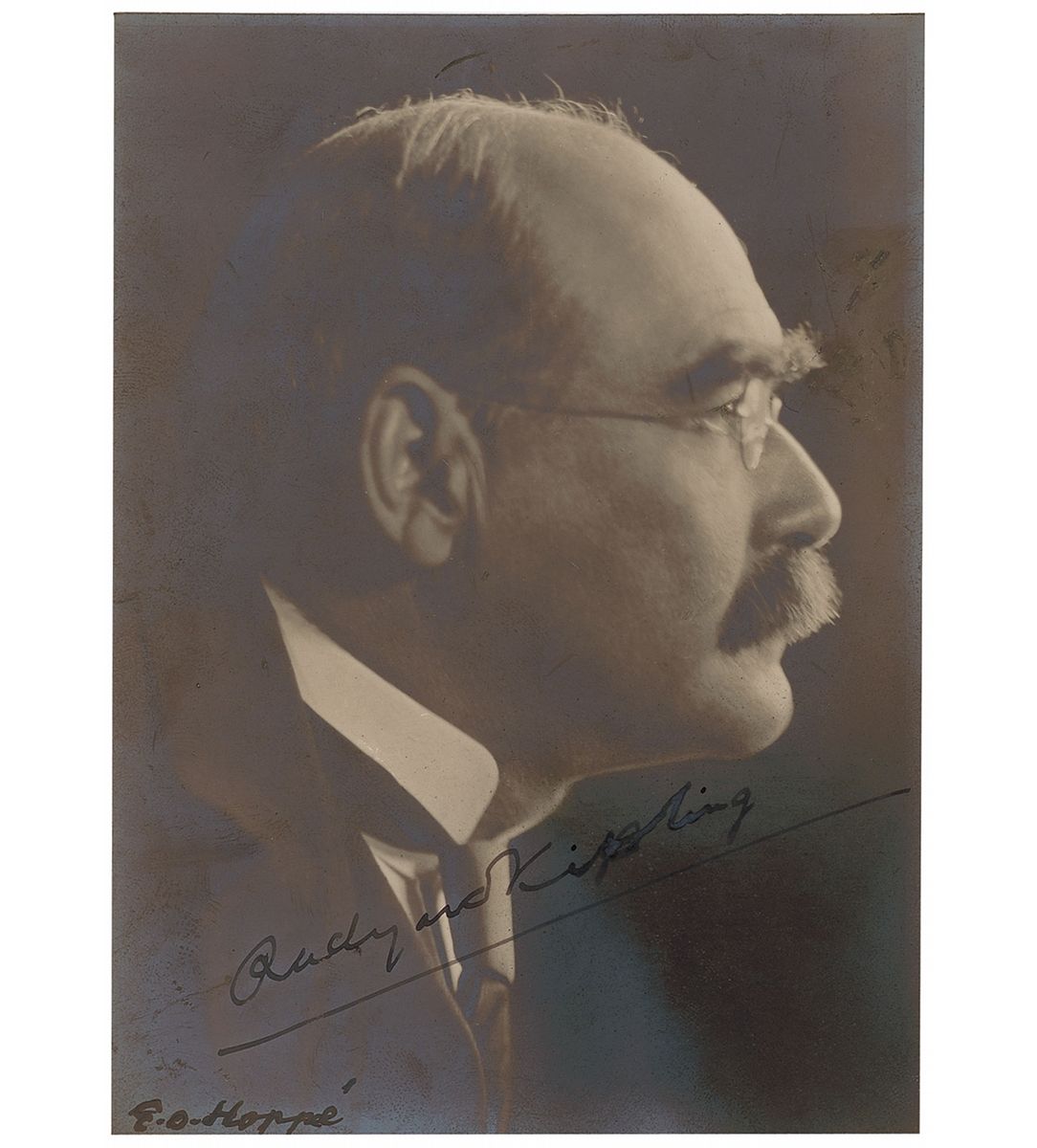 Vintage matte-finish 4.25 x 6 profile portrait by E. O. Hoppe, signed in fountain pen. An ink photographer’s notation is present in the lower left corner. In very good condition, with light to moderate silvering to image and dark background and some light surface marks to right edge. Accompanied by an unsigned copy of Kipling’s booklet entitled ‘The Holy War.’