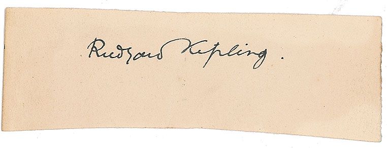 Crisp ink signature, “Rudyard Kipling,” on an off-white 3.75 x 1 clipped slip. In fine condition, with some scattered light toning.