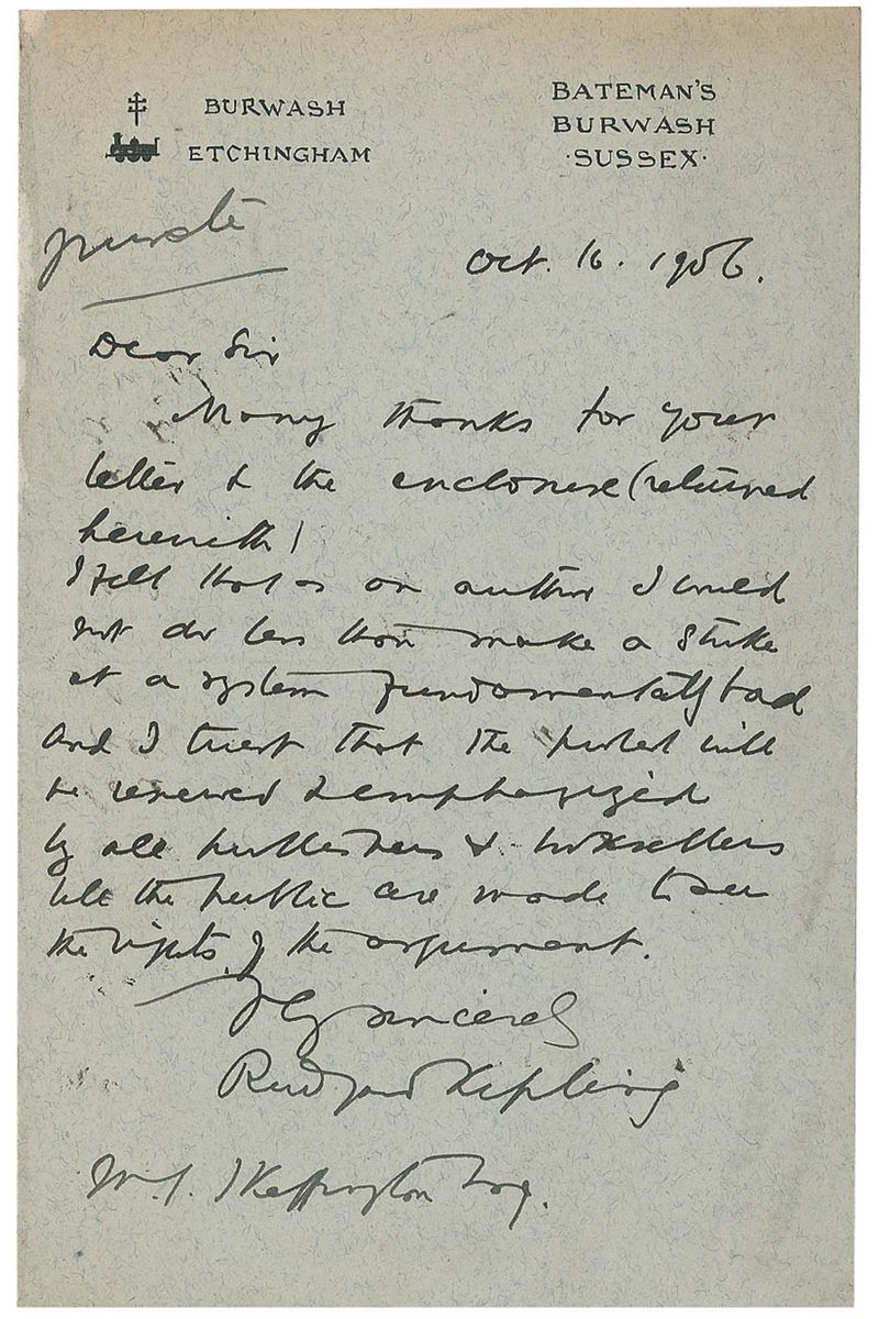 ALS, one page, 3.75 x 6, Bateman’s Burwash letterhead, October 16, 1906. Letter to a gentleman marked at the top, “Private.” In part: “I felt that as an author I could not do less than make a strike at a system fundamentally bad and I trust that the…will be renewed & emphasized.” In very good condition, with lightly trimmed left edge, central horizontal fold, and some scattered light toning and creasing.