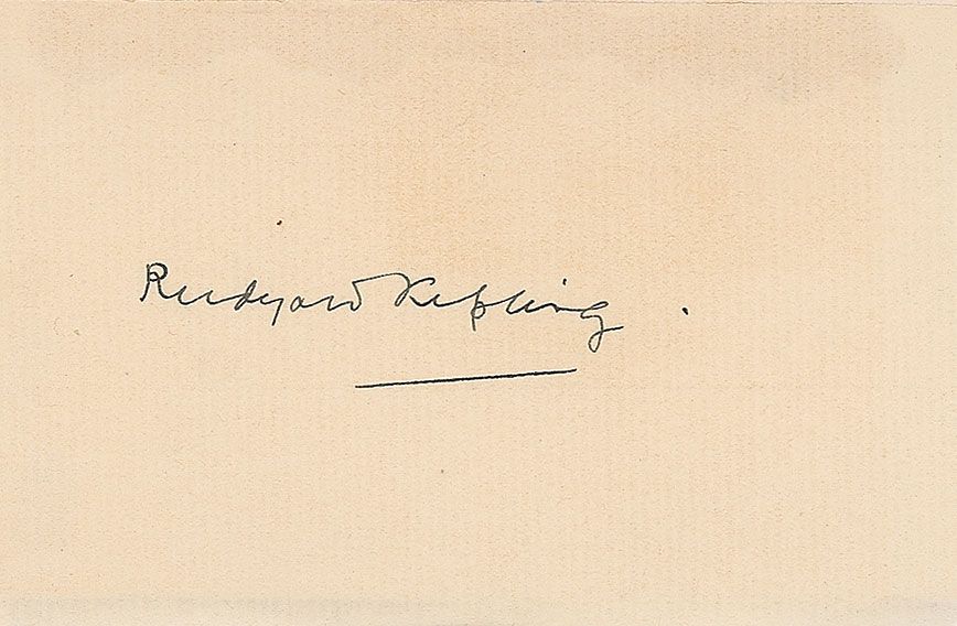 Ink signature, “Rudyard Kipling,” on an off-white 4 x 2.5 slip. Slip is affixed to a 4.5 x 3 custom-made collector’s card. In fine condition, with some light show-through from adhesive along reverse of top edge.