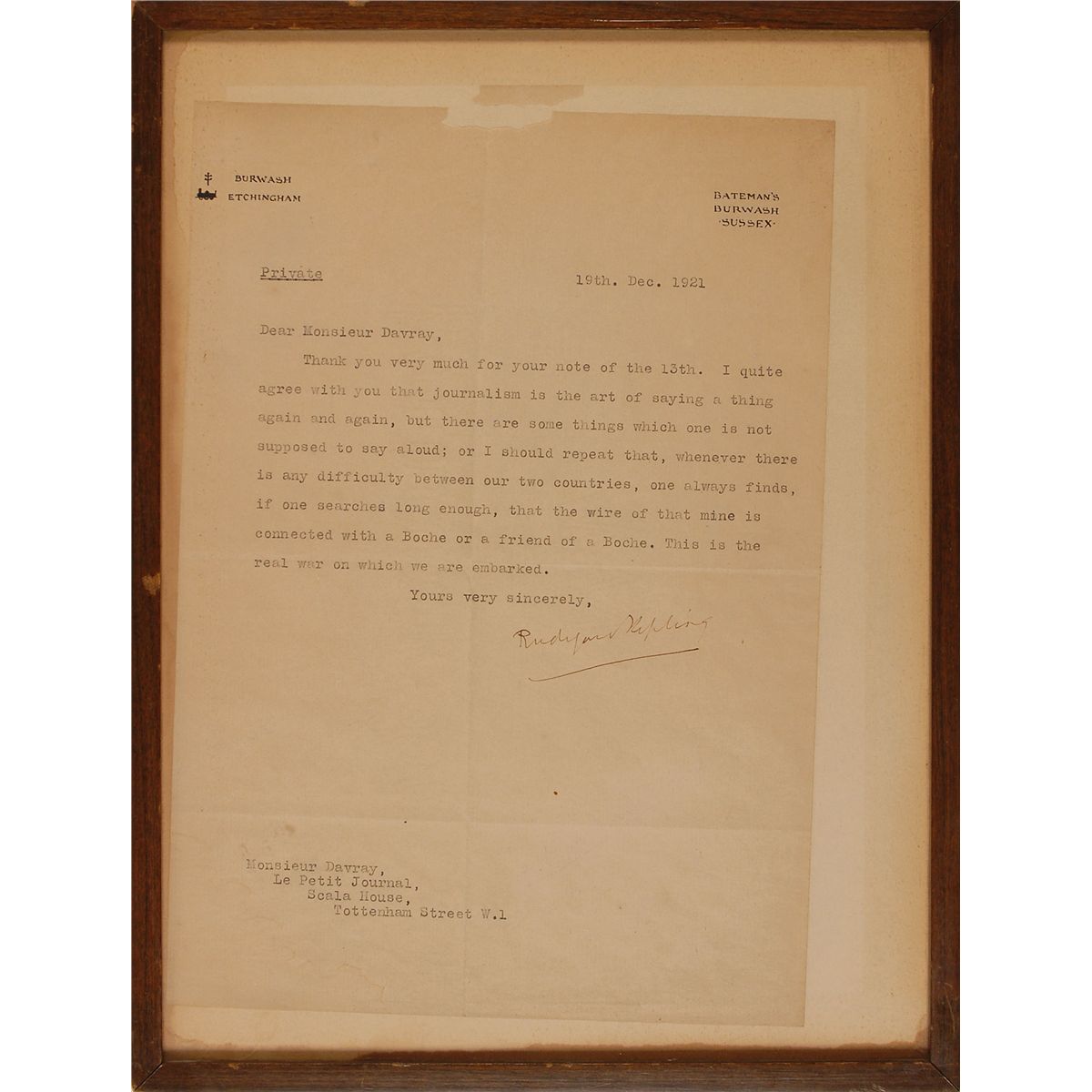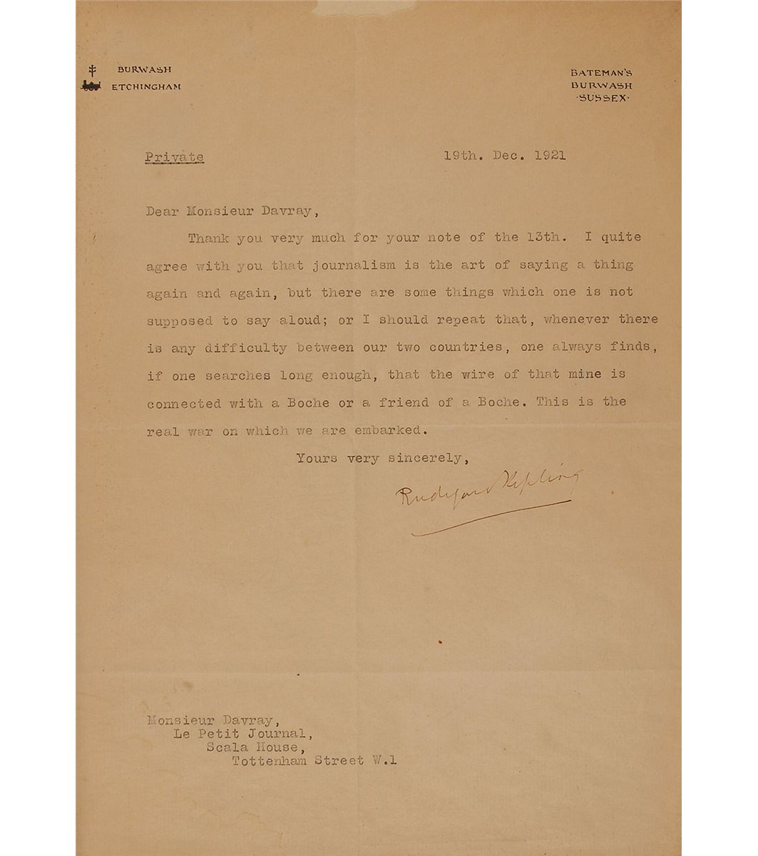 Superb-content TLS, one page, 7.25 x 10, Bateman’s Burwash letterhead, December 19, 1921. Letter headed at the top “Private,” to Monsieur Davray at Le Petit Journal. In part: “I quite agree with you that journalism is the art of saying a thing again and again, but there are some things which one is not supposed to say aloud; or I should repeat that, whenever there is any difficulty between our two countries, one always finds, if one searched long enough, that the wire of that mine is connected with a Boche or a friend of Boche. This is the real war on which we are embarked.” Framed to an overall size of 9.5 x 12.5. Reverse of the frame bears remnants of an older catalog entry. In very good condition, with intersecting folds, a uniform shade of toning, and a small area of paper separation to top edge. An unusual offering presenting a darker and opinionated side of the prolific author.