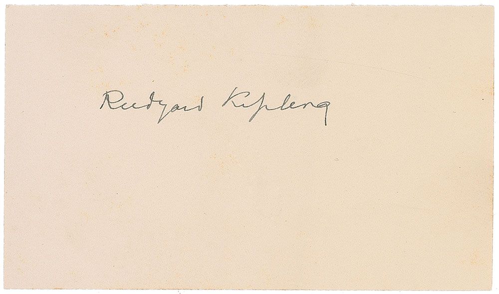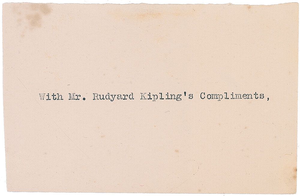 Ink signature, “Rudyard Kipling,” on an off-white 5 x 2.75 sheet. In fine condition. Accompanied by a brief typed note of compliments.