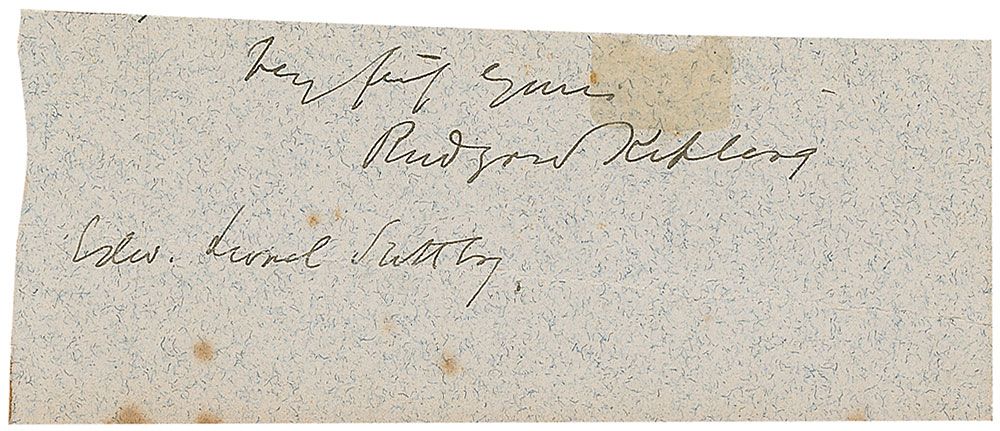 Ink signature and sentiment, “Very sincy yours, Rudyard Kipling,” on a light gray 3.75 x 1.5 slip, clipped from the closing of a letter. In very good condition, with small tape remnant over sentiment, mounting remnants to edges, and some scattered light toning and foxing.