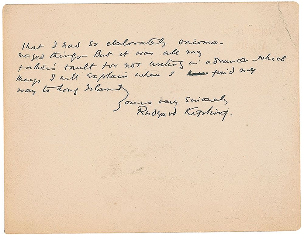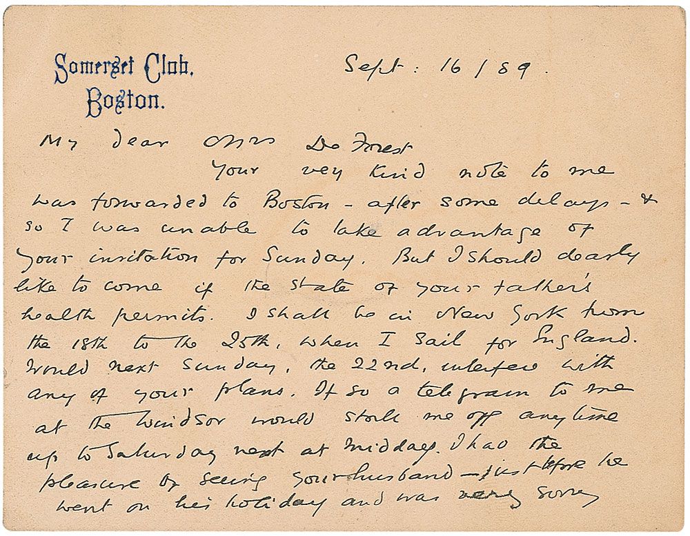 ALS, one page both sides, 4.25 x 3.5, Somerset Club, Boston letterhead, September 16, 1889. Letter to “Mrs. DeForest,” likely the wife of artist and family friend Lockwood de Forest. In part: “I should dearly like to come if the state of your father’s health permits. I shall be in New York from the 18th to the 25th, when I sail for England…I had the pleasure of seeing your husband—just before he went on holiday and was very sorry that I had so elaborately mismanaged things—But it was all my father’s fault for not writing in advance.” In fine condition, with a crease to the upper left corner.