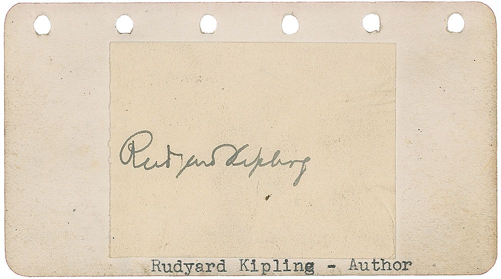 Vintage fountain pen signature, “Rudyard Kipling,” on a 2.5 x 2 slip affixed to an off-white 4.5 x 2.5 page. In fine condition, with light soiling to edges.