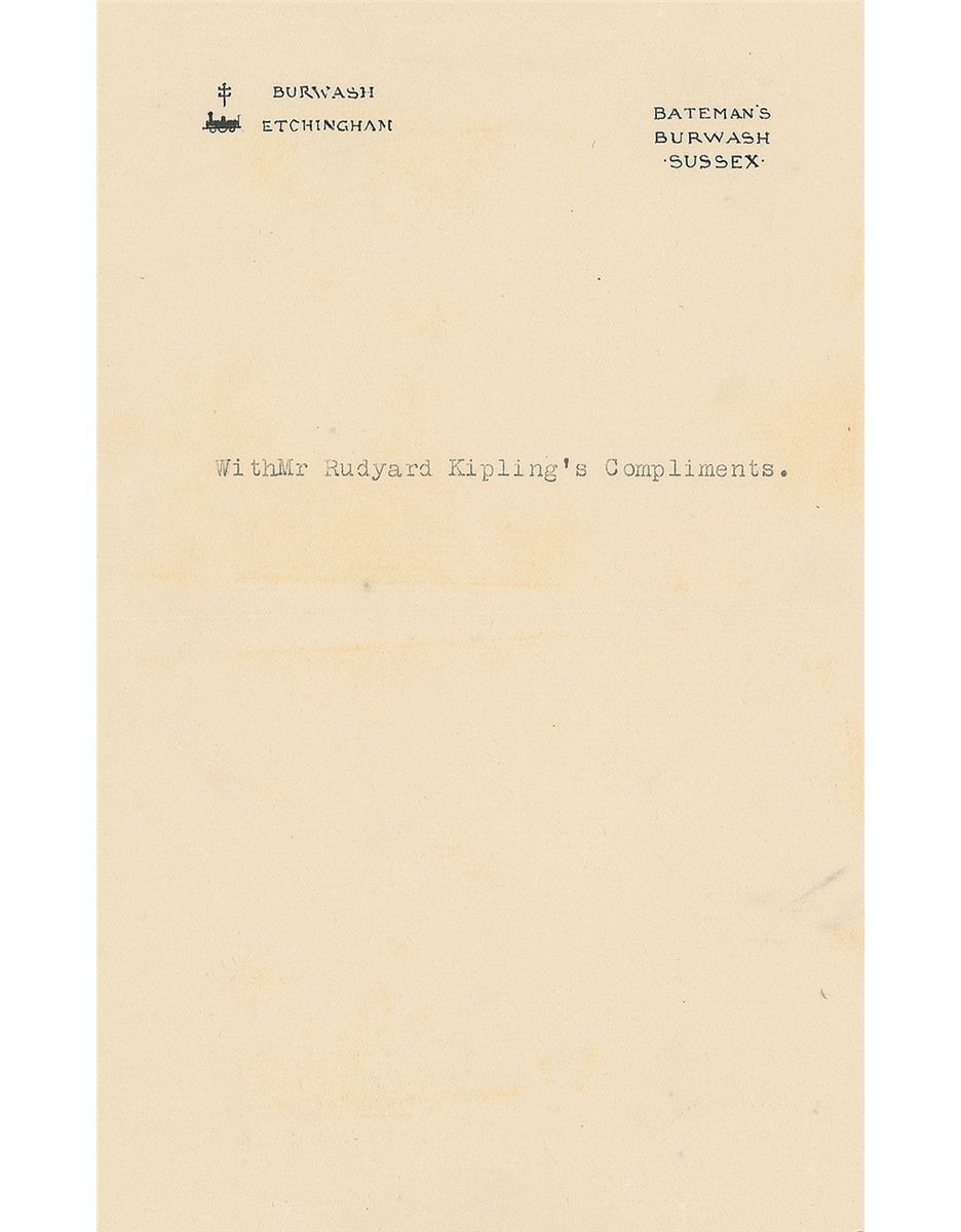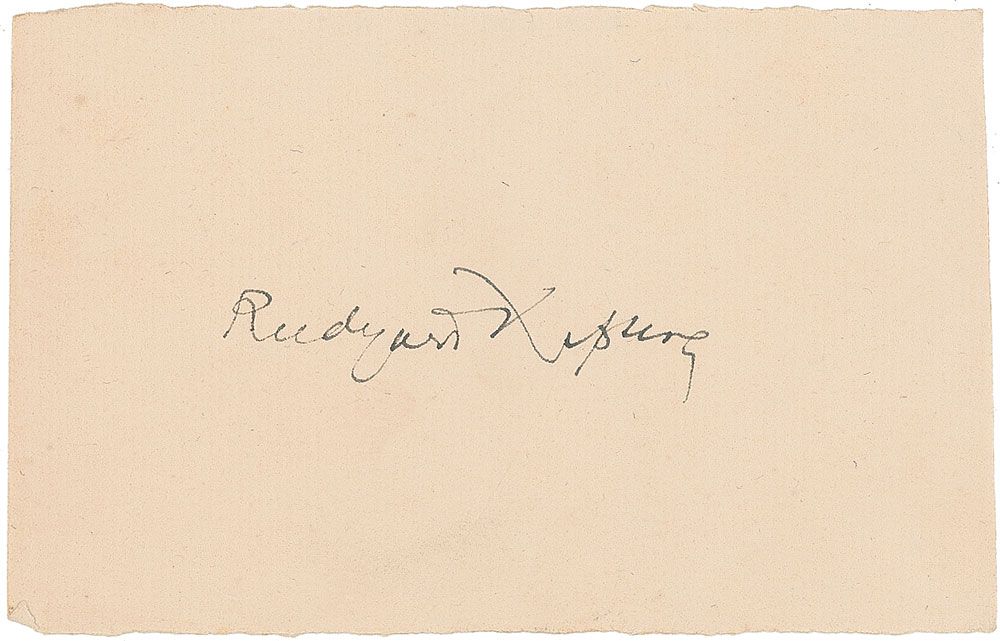 Ink signature, “Rudyard Kipling,” on an off-white 5 x 3 sheet. In fine condition. Accompanied by a brief unsigned letter of transmittal and the original mailing envelope.