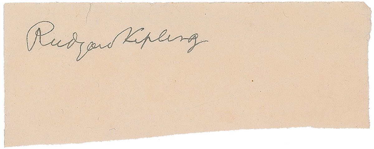 Ink signature, “Rudyard Kipling,” on an off-white 4 x 1.5 slip. In fine condition, with a light horizontal crease through portion of signature and a trivial tear to top edge.