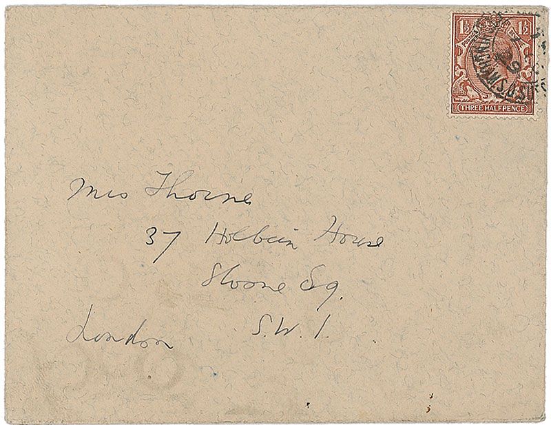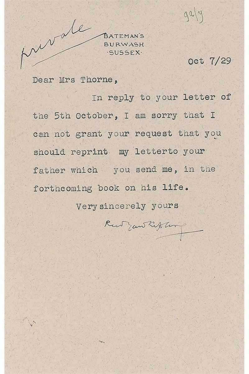 TLS, one page, 4.5 x 7, personal letterhead, October 7, 1929. Response to a publishing inquiry. In part: “I am sorry that I can not grant your request that you should reprint my letter to your father which you send me, in the forthcoming book on his life.” In fine condition. Accompanied by the original mailing envelope, addressed in Kipling’s own hand.
