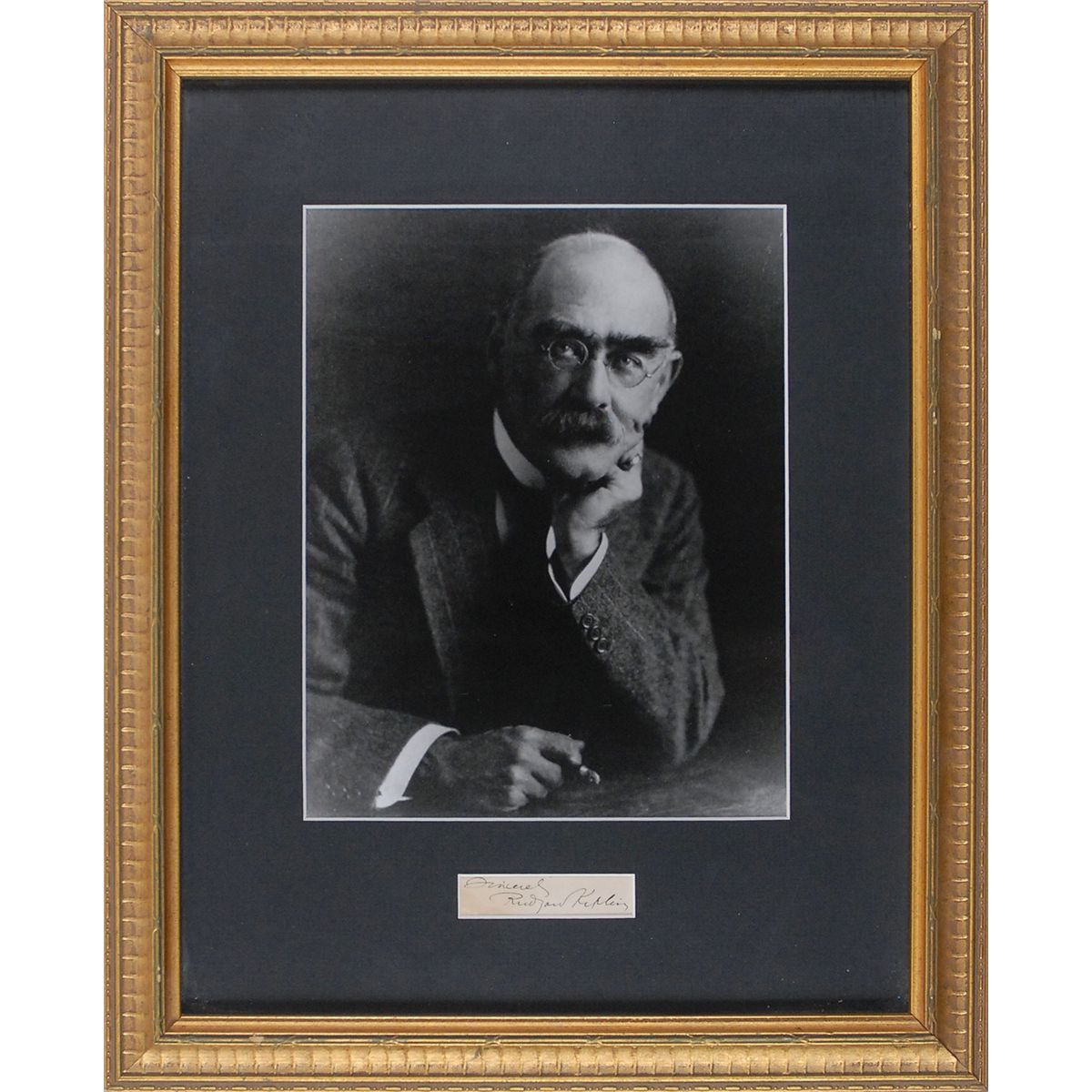 Fountain pen signature, “Sincerely, Rudyard Kipling,” on an off-white 2.5 x .5 slip clipped from the conclusion of a letter. Attractively matted and framed with a portrait of the author to an overall size of 13 x 16. In fine condition, with mild toning.