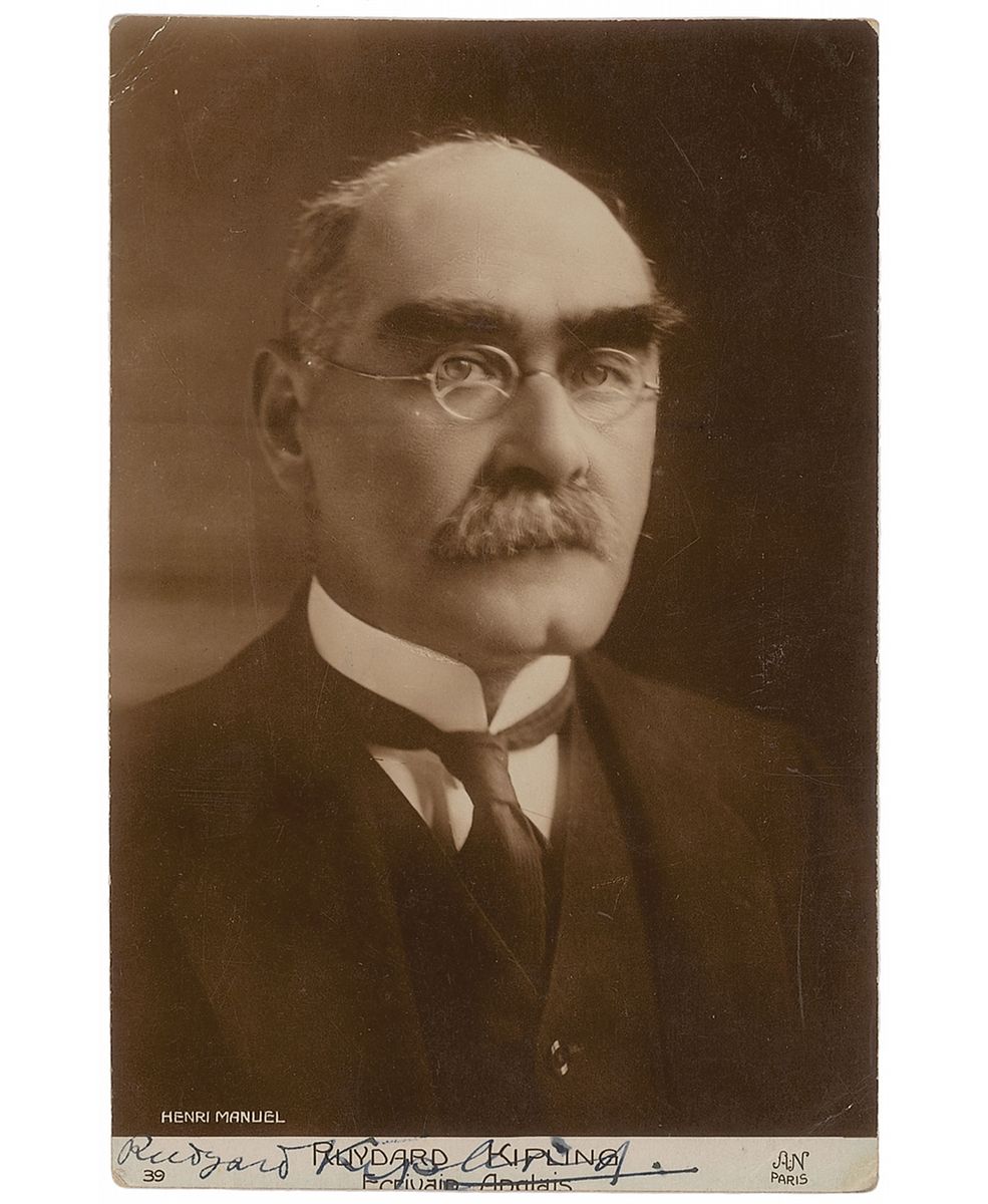 Uncommon 3.5 x 5.25 postcard photo of Kipling in a head-and-shoulders pose taken by Henri Manuel, signed in the lower border in black ink. A few light corner tip and surface creases, and his last name somewhat difficult to decipher against the caption text, otherwise fine condition.