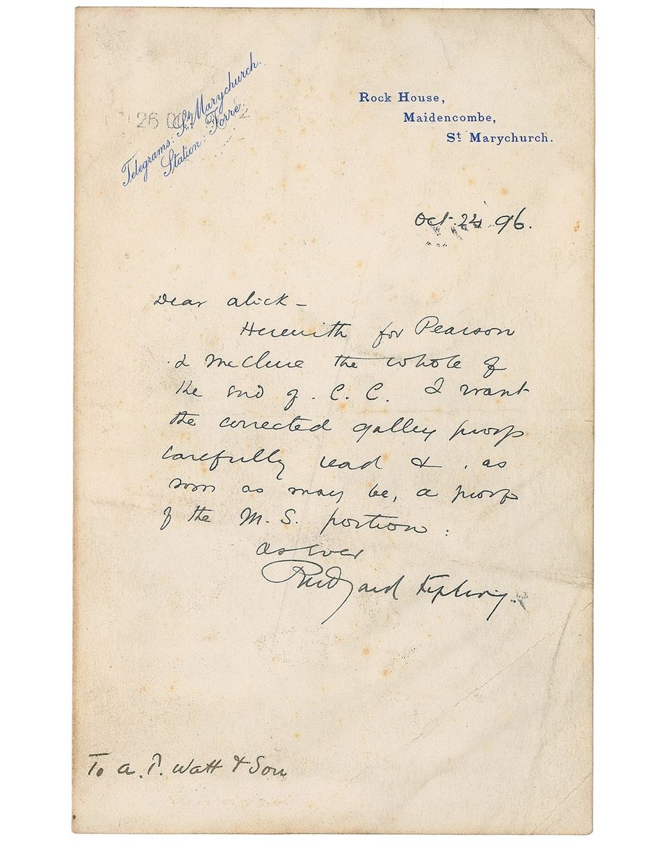 ALS, one page, 4.5 x 7, personal Rock House letterhead, October 24, 1896. Letter to his agent. In full: “Herewith for Pearson & McClure the whole of the end of C. C. [Captains Courageous]. I want the corrected galley proofs carefully read and as soon as may be, a proof of the M. S. portion.” In very good condition, with moderate to heavy overall creases and scattered foxing. Kipling’s novel followed the adventures of a teenager after being saved from drowning by a fishing boat in the north Atlantic, and was first serialized in McClure’s beginning in November 1896 before being published in book form the next year. MGM later made a popular film adaptation of the story, which earned Spencer Tracy his first Academy Award.