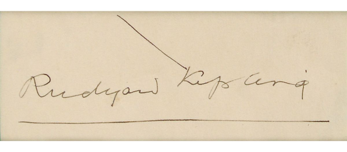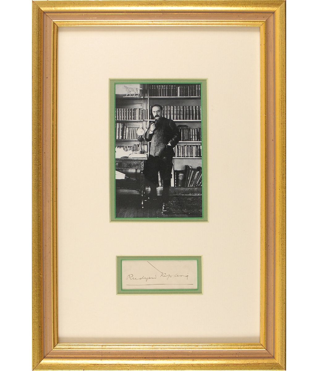 Ink signature, “Rudyard Kipling,” on an off-white 3 x 1.25 slip. Nicely double-matted and framed with a portrait of the author to an overall size of 10.5 x 15. In fine condition, with a stray ink mark above the signature.