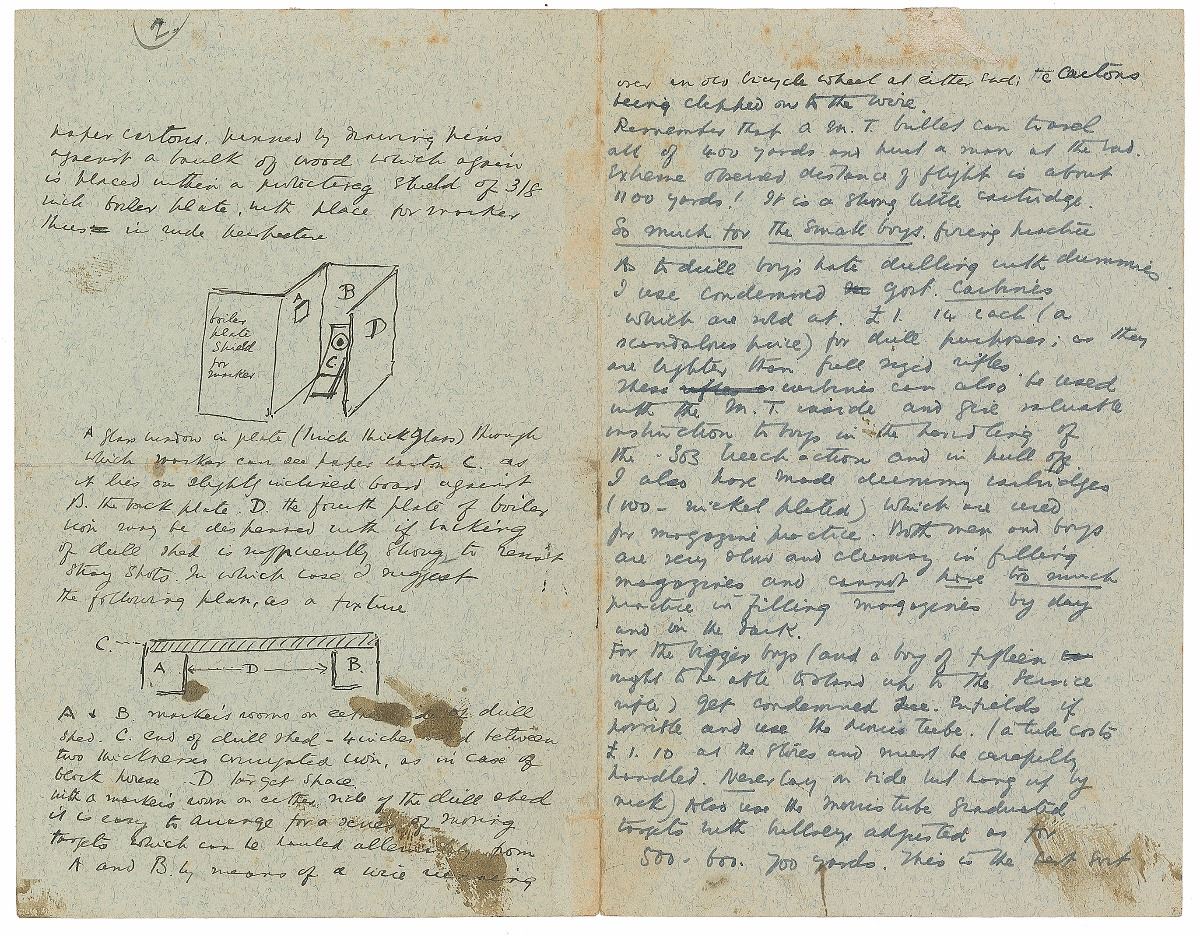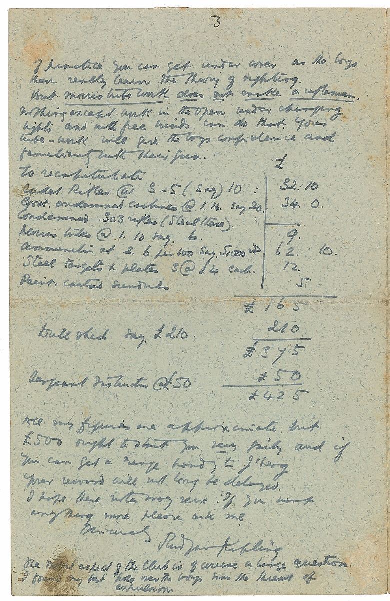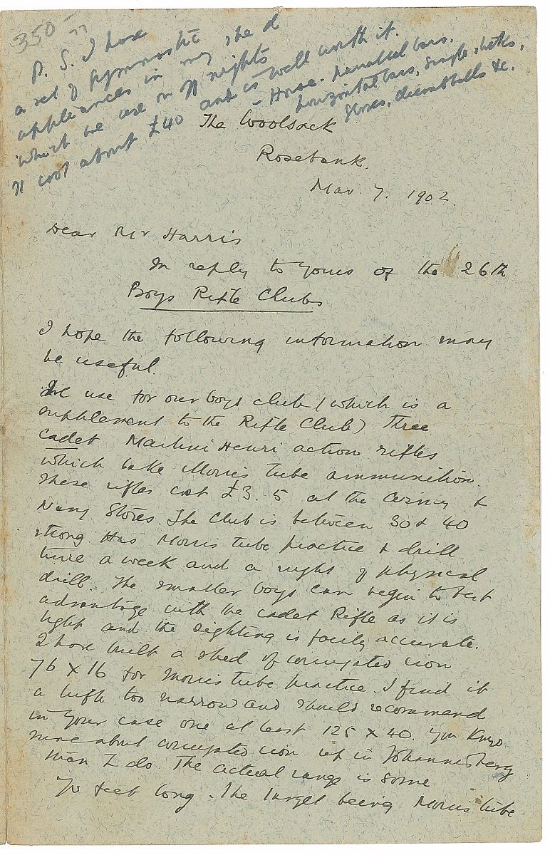 ALS, four pages on two adjoining sheets, 3.75 x 6, March 7, 1902. Written from his Woolsack Rosebank summer home, a letter to Mr. Harris, in part: “I hope the following information may be useful. We use for our boys club (which is a supplement to the Rifle Club) three cadet Marlini Henri action rifles which take Morris tube ammunitions. These rifles cost £3.5 at the Army & Navy Stores. The club is between 30 & 40 strong. Has Morris tube practice & drill twice a week and a night of physical drill. The smaller boys can begin to best advantage with the cadet rifles as it is light and the sighting is fairly accurate. I have built a shed of corrugated iron 76 x 16 for Morris tube practice. I find it a trifle too narrow and would recommend in your case one at least 125 x 40.” Kipling draws two detailed sketches of the proposed shed, and then goes into further detail concerning the rifles used and the estimated cost necessary to build and equip such a club, adding that “All my figures are approximate but £500 ought to start you very gaily.” Kipling also adds a postscript to the top of the first page. Partial separations to adjoining mailing fold, scattered soiling, and some mounting remnants to top edge of third page, otherwise fine condition.