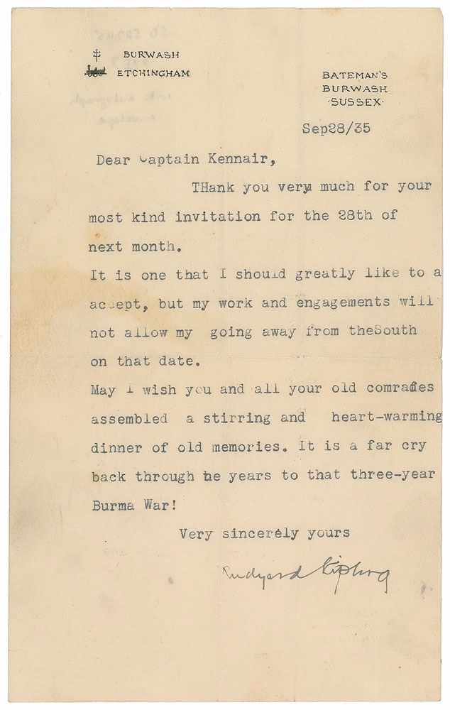 TLS, one page, 5 x 8, Burwash, Etchingham letterhead, September 28, 1935. Letter to Captain A. B. Kennair, in full: "Thank you very much for your most kind invitation for the 28th of next month. It is one that I should greatly like to accept, but my work and engagements will not allow my going away from the South on that date. May I wish you and all your old comrades assembled a stirring and heart-warming dinner of old memories. It is a far cry back through [t]he years to that three-year Burma War!" In fine condition, with intersecting folds. Accompanied by the original mailing envelope addressed in Kipling's own hand, as well as material related to the 50th anniversary of the Royal Welch Fusileers 1st Battalion, a regiment that took part in the siege and capture of Mandalay on November 28, 1885, including: a telegraph issued by the private secretary of King George V; a dinner menu for the reunion, signed inside by fourteen of the attendees, with several of them adding humorous pencil sketches; and a glossy 8 x 6 photo, affixed to its original mount, showing eighteen of the reunion members. Evoking the nostalgia of a British soldier for Asia's exoticism, Kipling published 'Mandalay' in the first series of the Barrack-Room Ballads, and Other Verses in 1892.