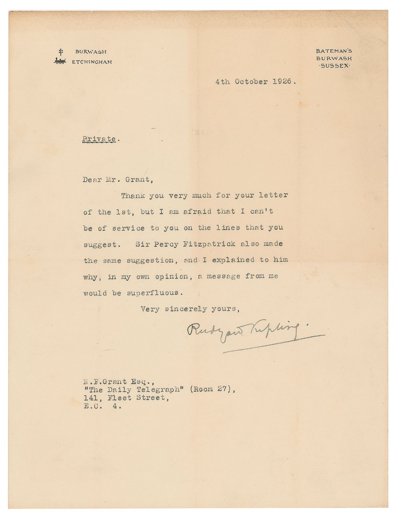 TLS, one page, 8 x 10.5, personal Bateman's letterhead, October 4, 1926. Letter to N. F. Grant of the Daily Telegraph, in part: "Thank you very much for your letter of the 1st, but I'm afraid that I can't be of service to you on the lines that you suggest. Sir Percy Fitzpatrick also made the same suggestion, and I explained to him why, in my own opinion, a message from me would be superfluous." In fine condition, with faint toning over the right half of the letter.