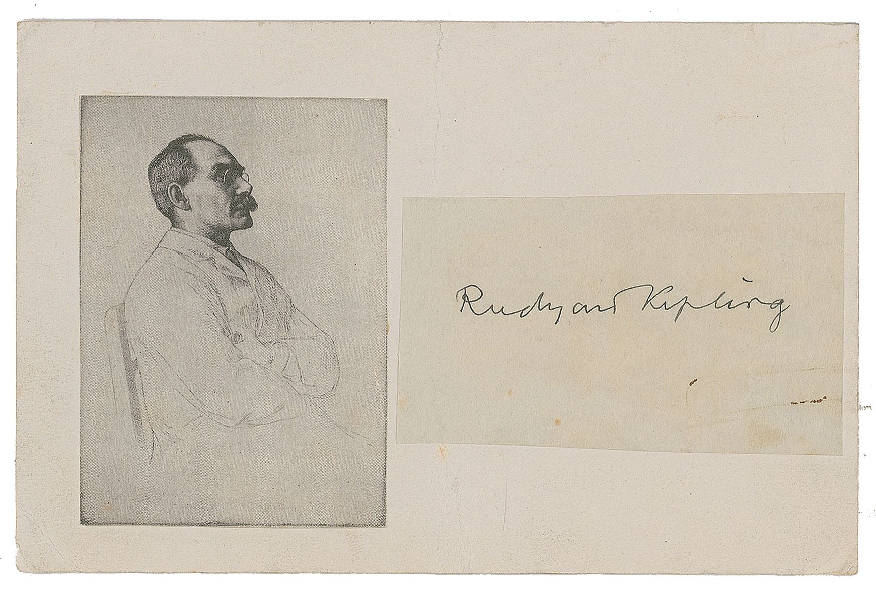 Vintage fountain pen signature, "Rudyard Kipling,” on an off-white 3.25 x 2 slip affixed to a larger card beside a small portrait. In very good to fine condition, with light wrinkling from mounting.