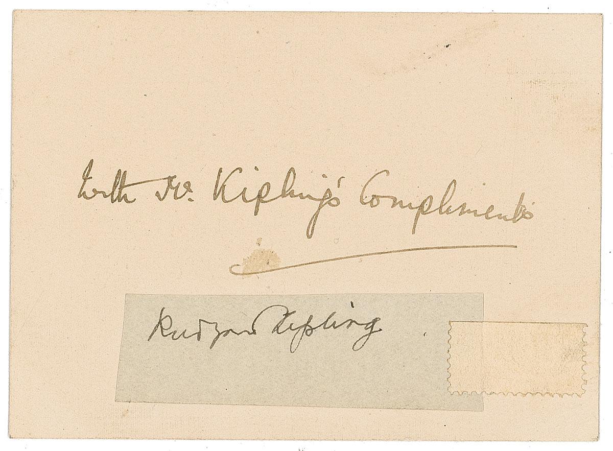 Vintage fountain pen signature on an off-white 2 x .5 slip, affixed via old tape on the right edge to a larger card on which Kipling’s secretary has penned, “With Mr. Kipling’s compliments.” In fine condition.
