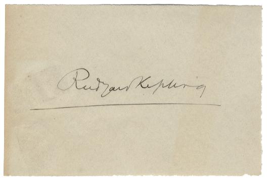 Rudyard Kipling (1865 – 1936). British author and poet. Signature on a slip of paper. 4 1/4" x 2 7/8". "Rudyard Kipling". Excellent.
