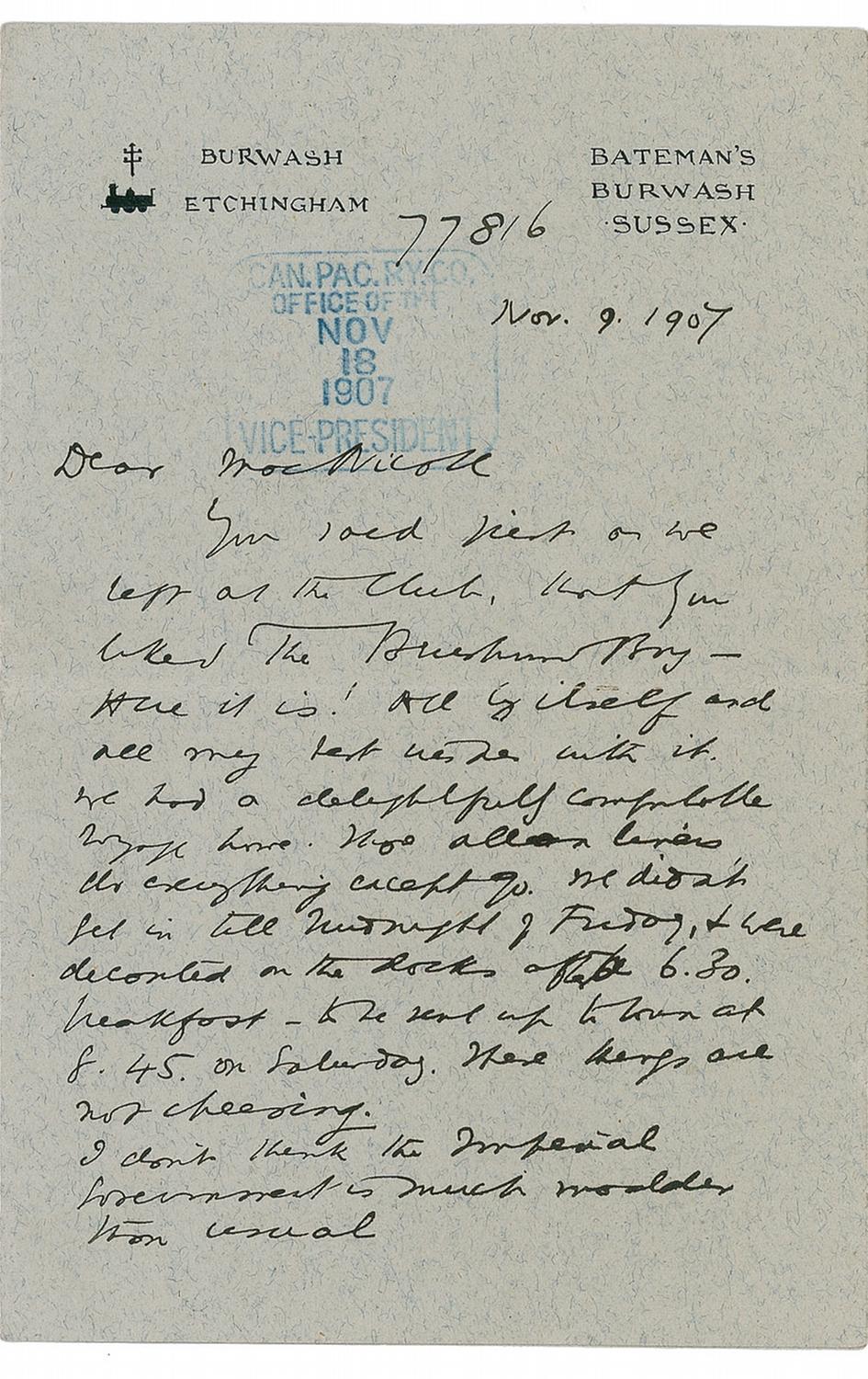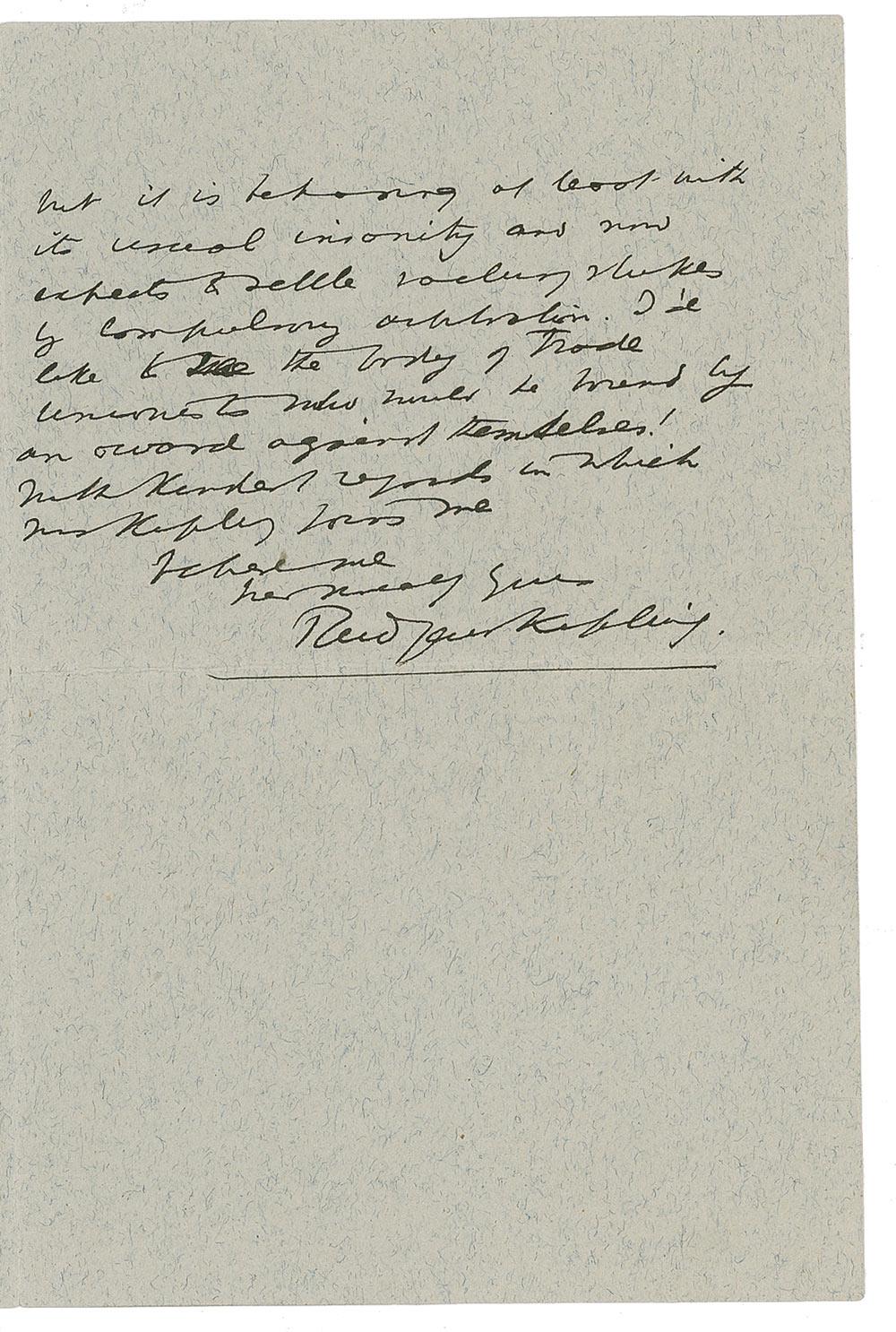 Nobel Prize–winning British author (1865–1936) best known for such colorful classics as Just So Stories, Captains Courageous, and The Jungle Book. ALS, two pages, 4 x 6, November 9, 1907. In a difficult to decipher hand, Kipling writes a friend. In part: “You said just as we left the club how you like The Burham Boy—Here it is! All by itself and all of my best wishes with it.” In fine condition with a horizontal fold.