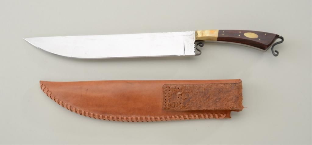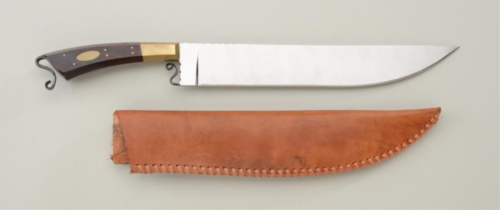 Ruetenik-signed modern fancy rosewood handled knife in like new condition with leather sheath, approx. 14-1/2” overall with an approx. 10” blade. Est.: $400-$800.
