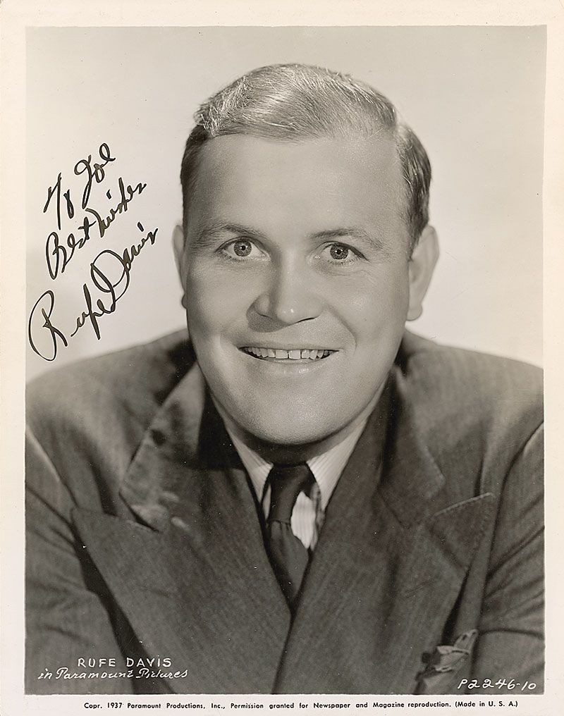 Vintage glossy 8 x 10 Paramount publicity photo from 1937, signed and inscribed in fountain pen “To Joe, Best wishes, Rufe Davis.” In fine condition, with some scattered light creases and surface marks.