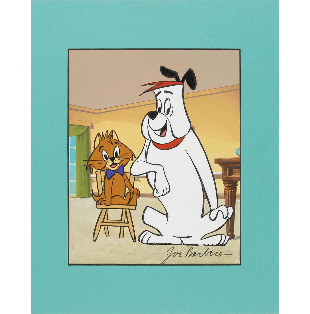 (Hanna-Barbera Studios, Circa 1970s) Original publicity cel featuring Ruff and Reddy from The Ruff and Reddy Show. The cel is placed on a hand-painted background. Image of the pair posing side-by-side measures 6.5 x 8, with a mat opening of 7.5 x 9.5, and is matted to an overall size of 11 x 14. In fine condition.