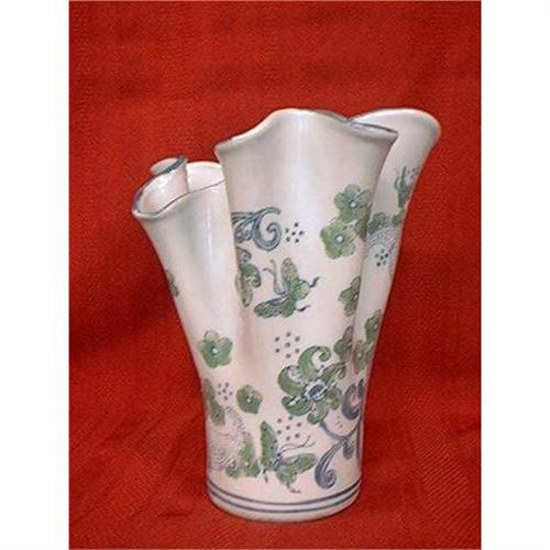Vase has ruffled design and is off white color with green flowers and blue vines. This vase measures 7 inches wide and 8 inches high and is in excellent condition with no chips or cracks