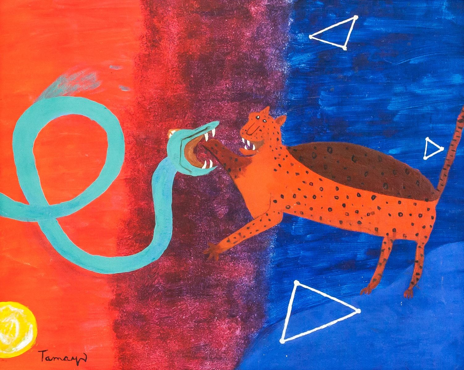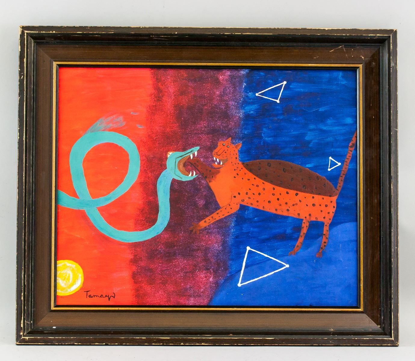 Oil on canvas, framed. Featuring a surrealist portrait of a snake and cougar. Signed Tamayo on the lower left corner. Attributed to Rufino Tamayo (1899-1991, Mexican). 40.5 x 51 cm (16 x 20 inches). Framed size: 52 x 62.5 cm (20.5 x 24.5 inches). PROVENANCE: Southern Ontario estate