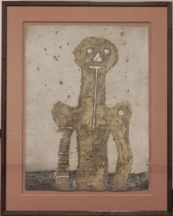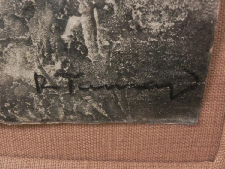 Dark, yet with a happy expression, this figure peers at the viewer with mysterious welcoming. Artist: Rufino Tamayo Signature: "R Tamayo" in black wax pencil, lower right Title: Torso Medium: Etching on hand-made paper Edition: Hors Commerce, marked HC, lower left Image size: 29 7/8 x 22 1/8 inches Framing: On fabric covered backing in matting, in dark brown wood frame Frame size: 38 1/2 x 30 1/2 inches Condition: Excellent, with a few scuffs to the frame, and surface scrapes, upper right corner The work of Rufino Tamayo (Mexico, 1899 - 1991) is held in the permanent collections of all the world's major museums and in many important corporate and private collections. Rufino Tamayo is being recognized now as one of the most influential artists of the 20th century.