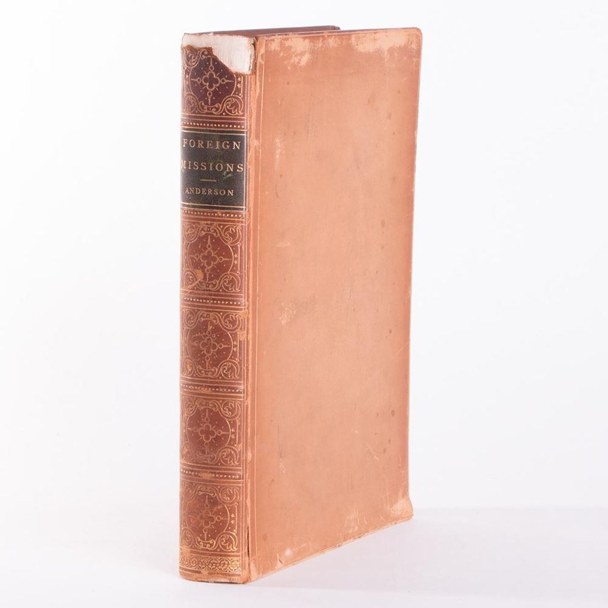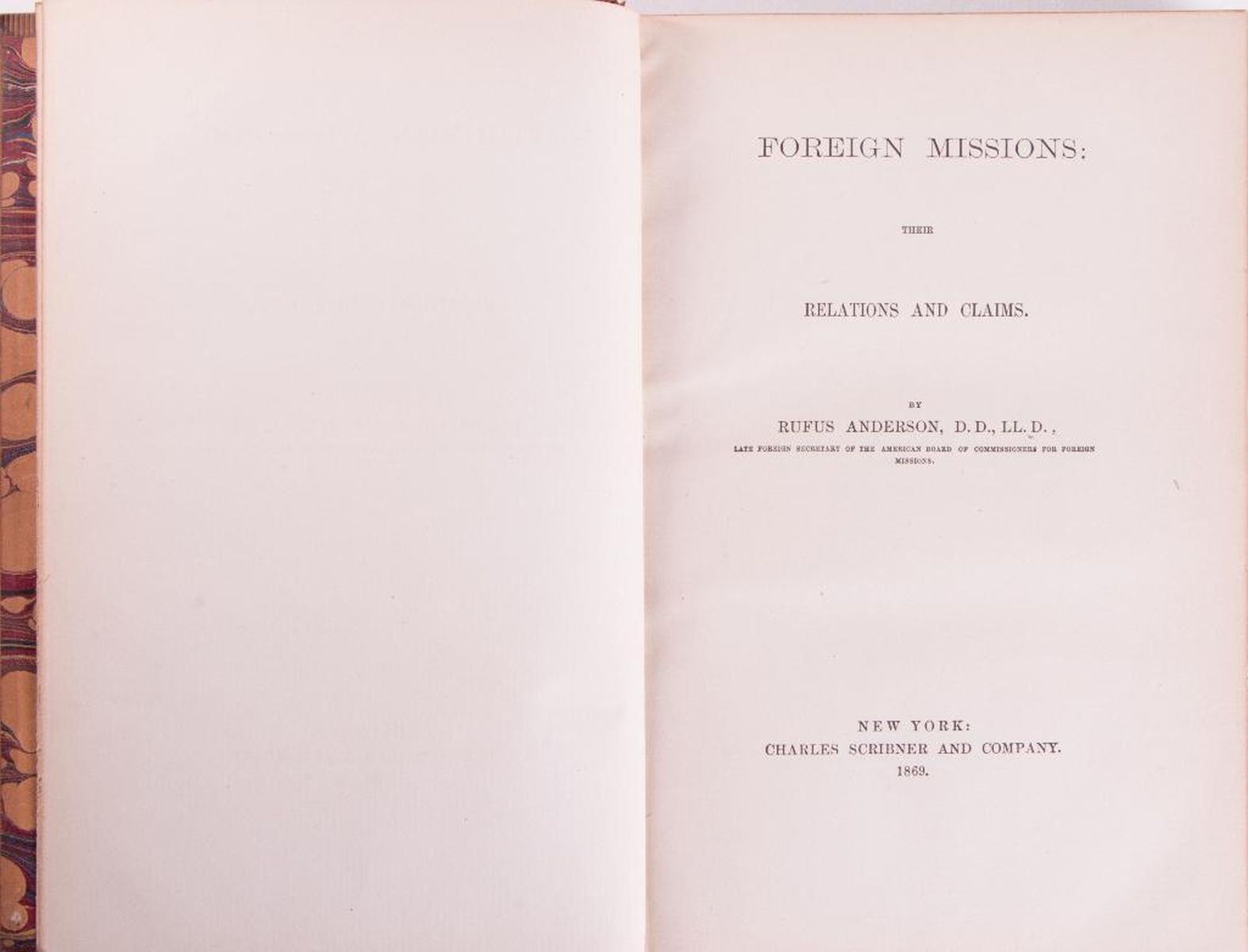 Title: Foreign Missions: Their Relations and Claims Author: Rufus Anderson, D.D., LL.D. Place: New York Publisher: Charles Scribner and Company Date: 1869 Description: Bound in morocco brown leather, gilt design on spine. Marbled endpapers. Condition: Very good condition. Missing piece of leather on top spine.