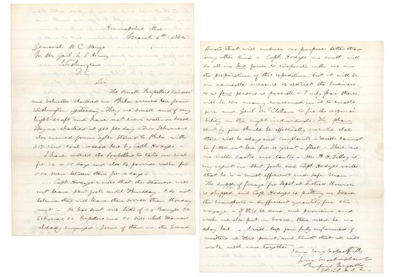 “I only fear there will be too many concerned in it to enable you and Genl. McClellan to fix the responsibility in the right individuals. The plan sent by you should be effectually executed, else there will be delays and complaints...” ALS. 2 pages. 8” x 10”. Annapolis Md. March 4th, 1862. To General M.C. Meigs. Qr. Mr. Genl. U.S. Army, Washington D.C. “The small Propellers “Reindeer” and “volunteer” chartered in Phila arrived here from Washington yesterday. They are small and of very light draft and have not even water on board. They are chartered at $60 per day. Two Schooners also arrived from Tyler, Stone & Co. Phila with 317 tons coal ordered here by Capt. Hodges.” “I have ordered the Propellers to take our coal for 12 or 15 days and also provide water for 500 men between them for 10 days.” “Capt. Hodges writes that the Steamers will not leave New York until Thursday. I do not believe they will leave there sooner than Monday next. He has sent me lists of 24 Barges, 72 Schooners, 52 Propellers and 90 side – wheel Steamers already engaged. Some of them are the Sound boats that will answer our purpose better than any other kind. Capt. Hodges no doubt will do all in his power to cooperate with us in the preparation of this expedition, but it will be an advisable measure to restrict the business to as few persons possible. I only fear there will be too many concerned in it to enable you and Genl. McClellan to fix the responsibility in the right individuals. The plan sent by you should be effectually executed, else there will be delays and complaints. Vessels cannot be fitted out here for so great a fleet. There are no water casks nor tanks. Mr. A.H. Sibley is my agent in New York and Capt. Hodges writes that he is a most efficient and safe man. The supply of forage for depot at Fortress Monroe is shipped and Capt. Hodges is putting on board the transports a sufficient quantity for the voyage. If this be done and provisions and water are also put on board, there need be no delay here. I will keep you fully informed of matters at this point, and trust that all will work well and together.” On February 28, 1862 Lincoln authorized McClellan to procure vessels for his secret invasion of the South, intended to break its backbone and end the war quickly. At the time it was referred to as the “Urbana Expedition”. It later became known as “The Peninsular Campaign.” Just a few days after receiving Lincoln’s authorization, Ingalls here writes to Quartermaster General Montgomery Meigs detailing the status of preparations and the procurement of vessels. The massive operation headed south with a flotilla of over 400 vessels transporting more than 100,000 soldiers and equipment for nearly 200 miles to Fort Monroe, Virginia. McClellan operated in such secrecy to the point that even Lincoln was excluded from the planning. The Campaign resulted in a complete disaster and the needless loss of many lives, accomplishing nothing to further the Union War effort. A nice detailed letter which starkly details the military’s lack of ships as they were leasing the vessels for the campaign from private operators. Fine.