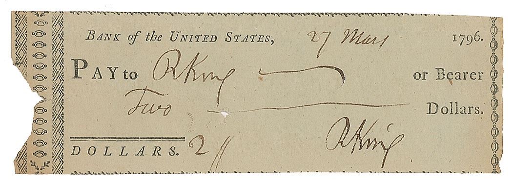 Twice-signed Bank of the United States check, 6 x 2, filled out and signed by Rufus King, "R. King," payable to himself for $2, March 27, 1796. In fine condition.