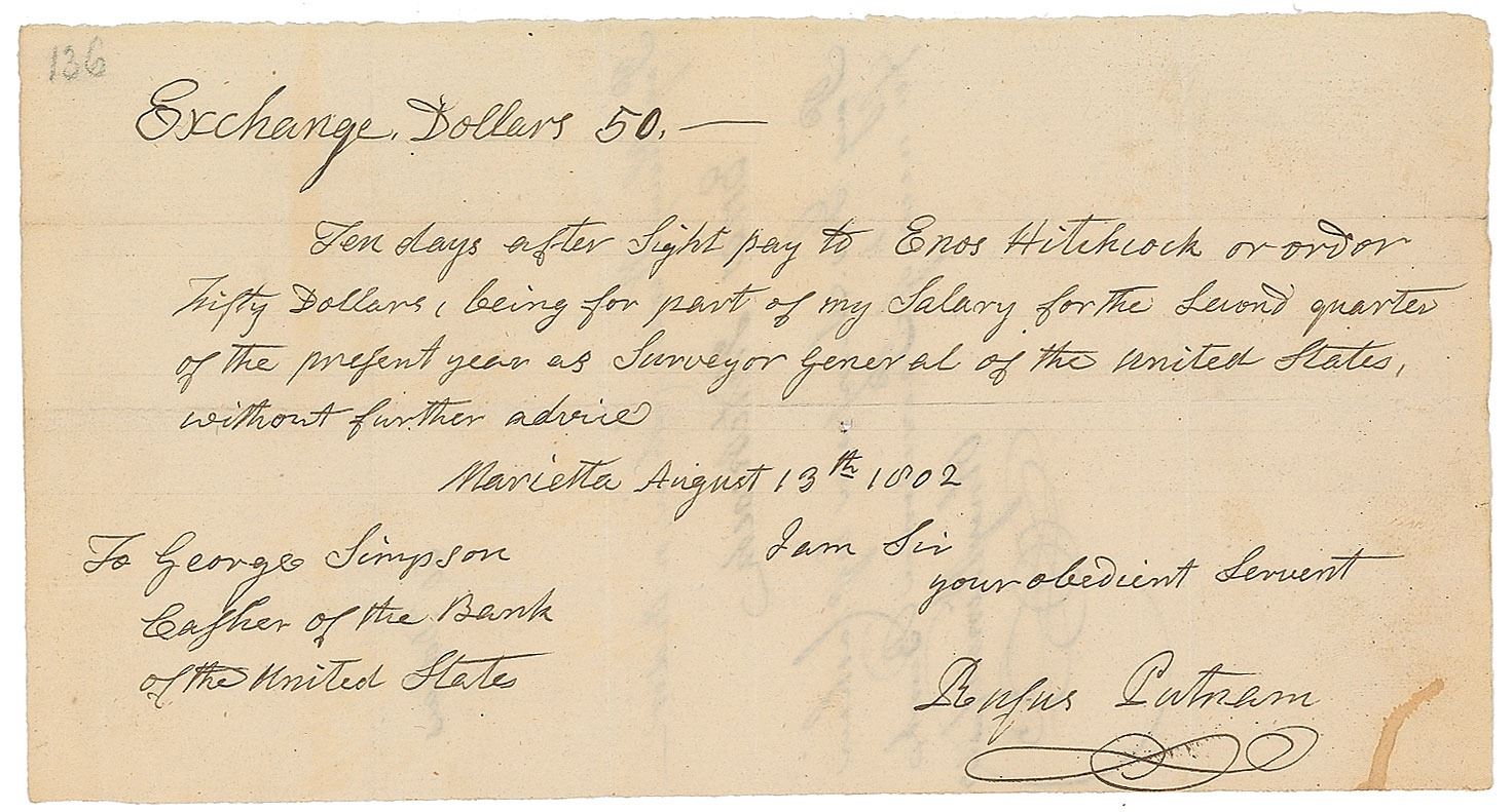 Colonial military officer during the French and Indian War, and a general in the Continental Army during the Revolution (1738–1824) who, as an organizer of the Ohio Company, was instrumental in the initial settling of the Northwest Territory. ADS, signed “Rufus Putnam,” one page, 8.25 x 4.25, August 13, 1802. Pay order issued to George Simpson, cashier of the Bank of the United States. In full: "Ten days after Sight pay to Enos Hitchcock or order Fifty Dollars, being for part of my Salary for the second quarter of the present year as Surveyor general of the United States, without further advice." In fine condition, with a thin stain to the lower right corner.