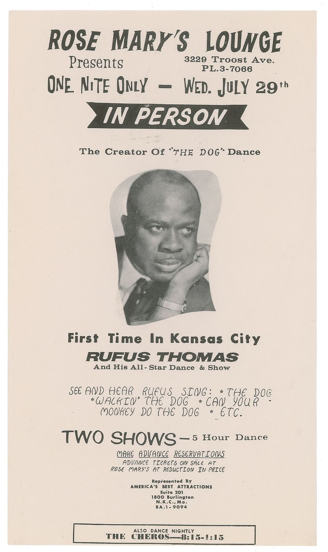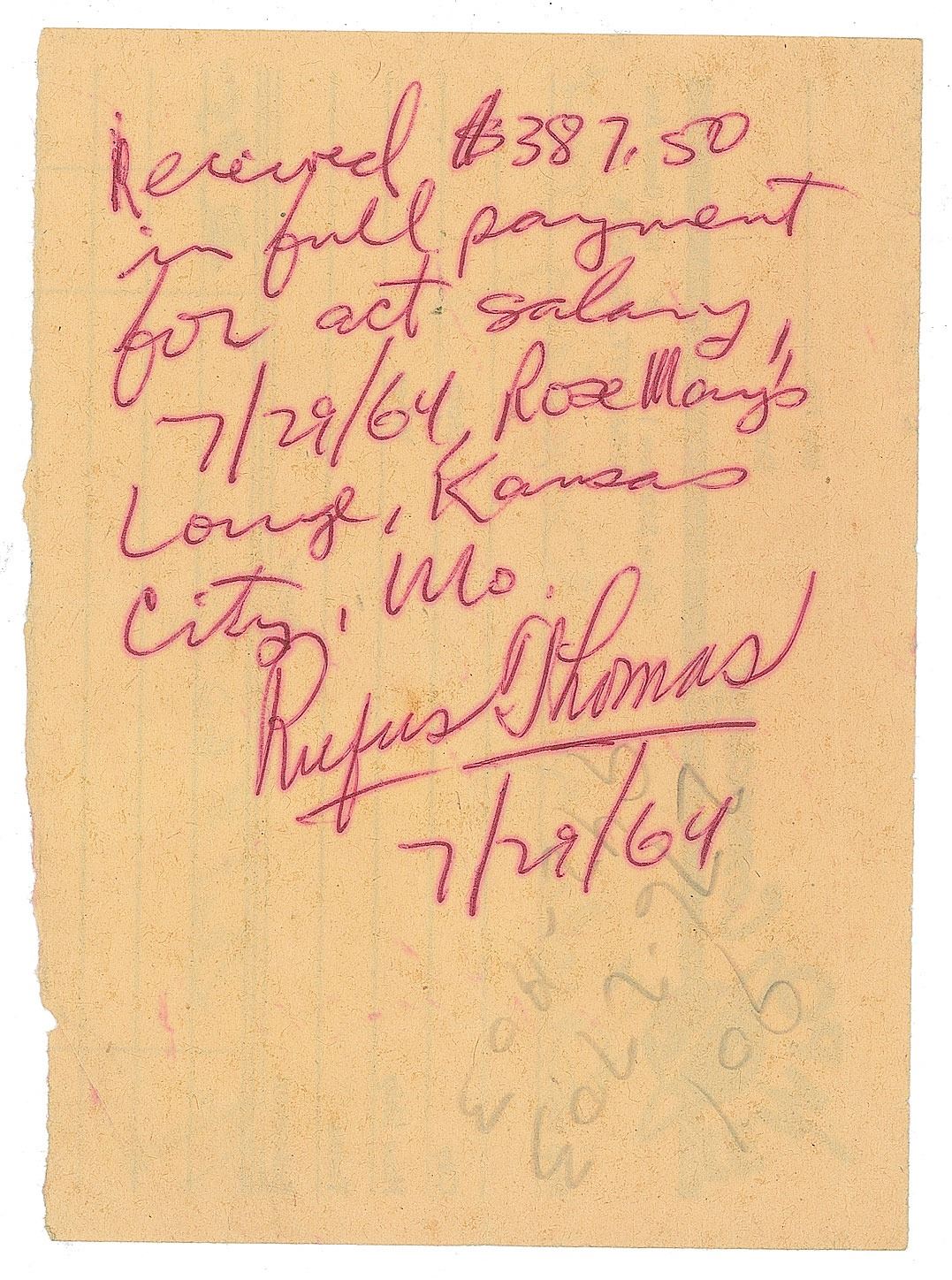 Versatile rhythm-and-blues, funk, soul and blues singer, songwriter, dancer, DJ and comic entertainer from Memphis (1917–2001). ADS by Thomas on the reverse of a Tempo Company shipping form, 4 x 5.5, in full: "Received $387.50 in full payment for act salary, 7/29/64 Rose Mary's Lounge, Kansas City, MO, Rufus Thomas, 7/29/64." Includes an original handbill for Rufus Thomas at Rose Mary's Lounge in Kansas City on June 29, [1964], 5.5 x 9.5, billing him as "The Creator Of 'The Dog' Dance." In fine condition. Accompanied by an unsigned publicity photo of Thomas, featuring the same portrait featured on the handbill.