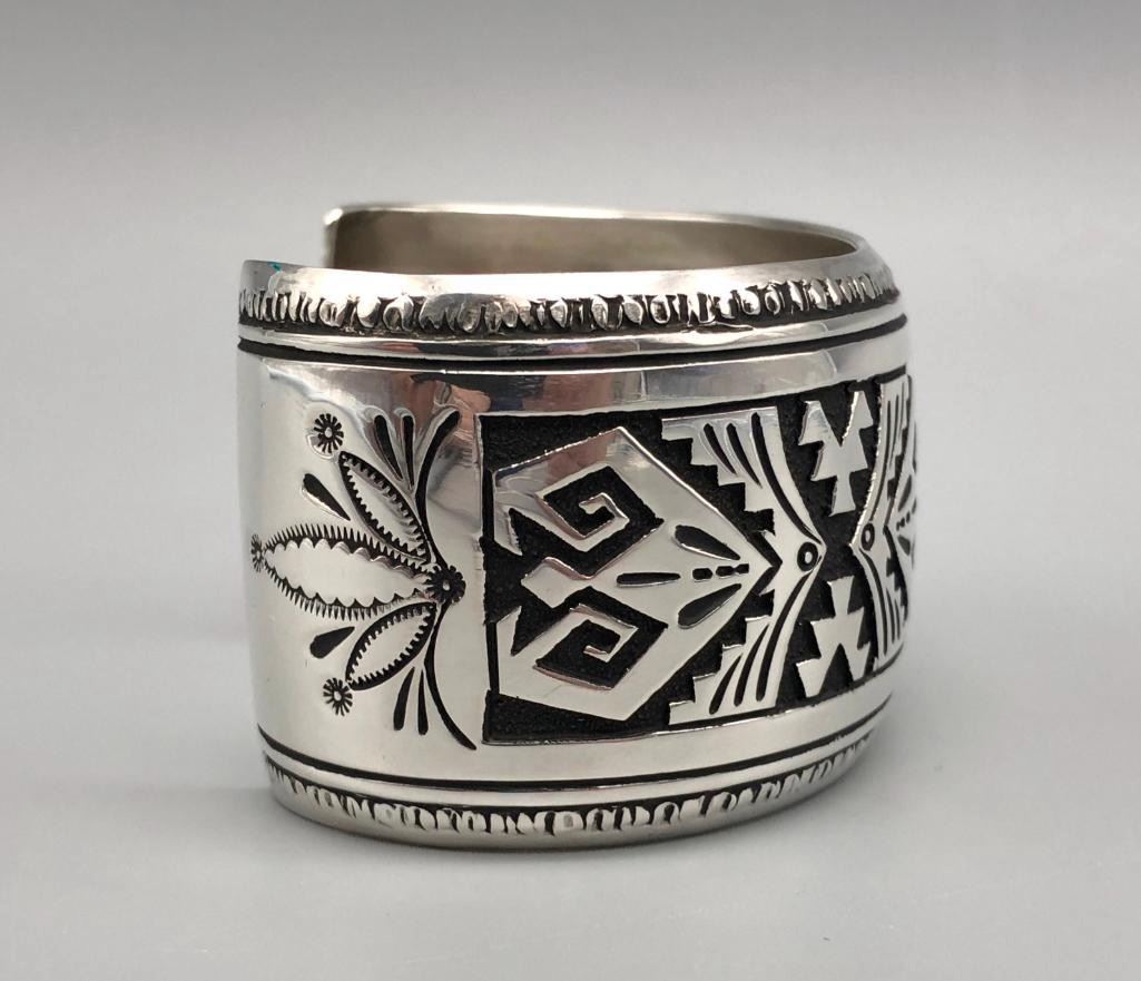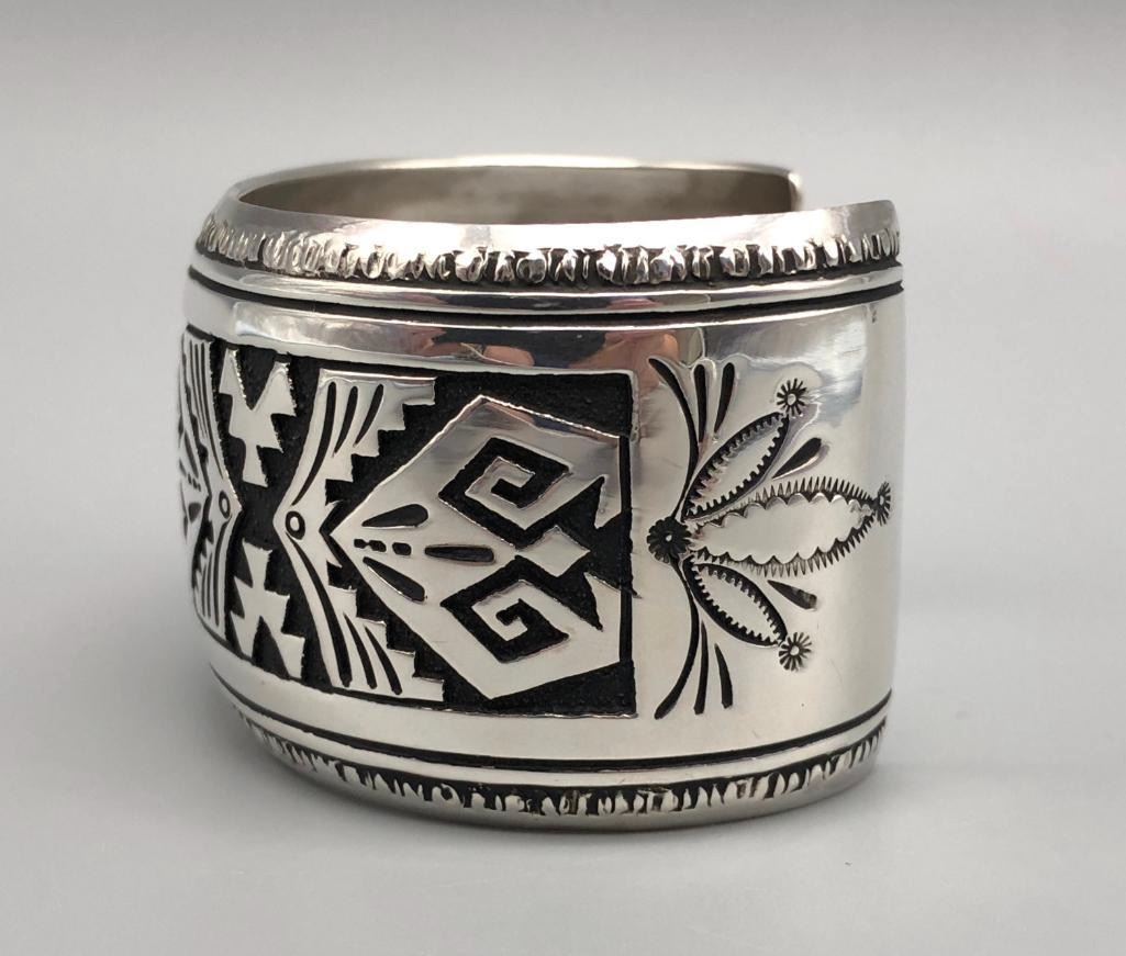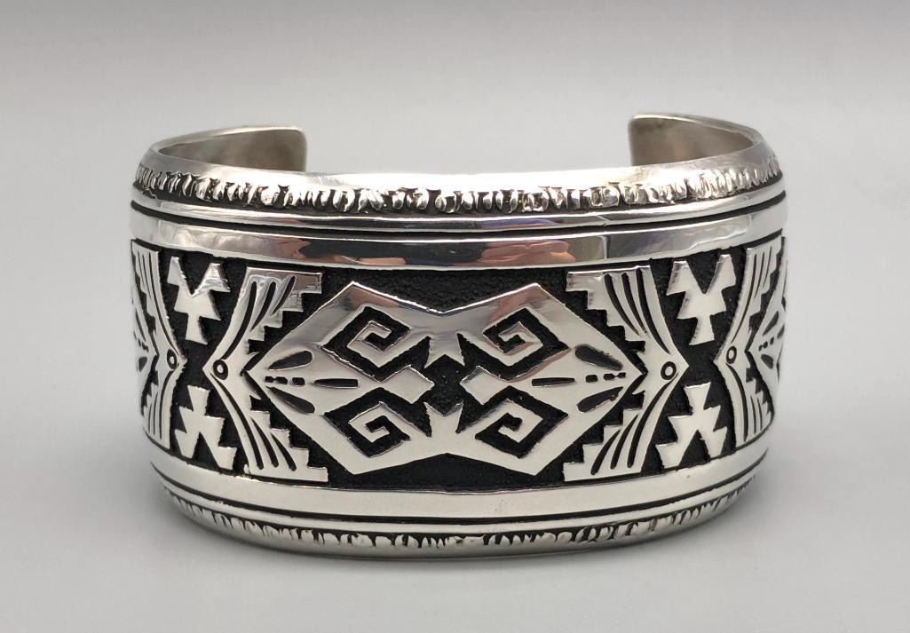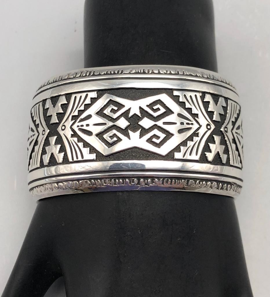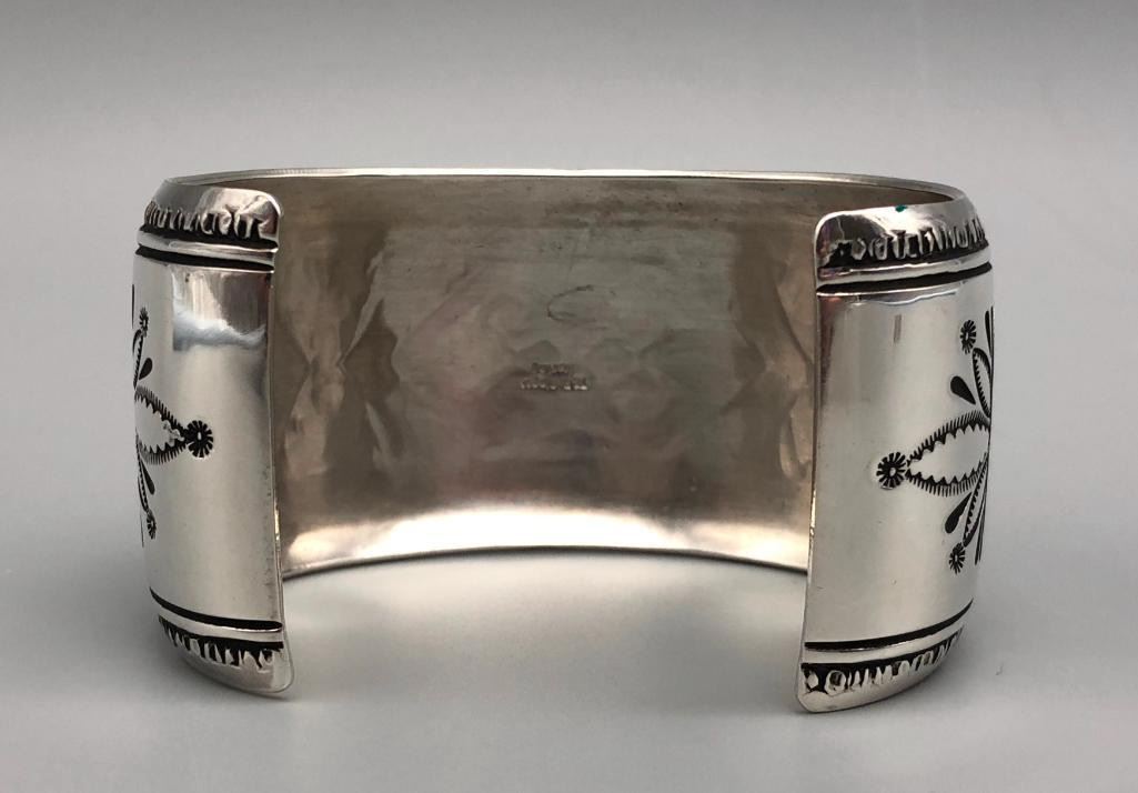 Up for consideration is this rug pattern sterling silver bracelet by Tommy Singer. This is a gorgeous overlay bracelet, with a stunning rug pattern and lovely hand stamped designs. Stamped as sterling. MAKER: Hallmarked T & R Singer. Tommy Singer (1940-2014; Navajo). Active since 1960s-2014. He was a prolific designer and maker. APPROX AGE: Fairly modern. SIZE: Inside circumference measures 6 inches long. Opening is an additional 1-5/8 inches, fitting a 7-5/8 inch wrist. Width is 1-1/2 inches. Weighs 66.5 grams. CONDITION: Good for its age, normal wear expected. Please look closely at the pictures as they are an important part of our description and are hereby incorporated into the description, specifically with regards to condition. SHIPPING: There will be a $5 handling / packaging fee for shipping this lot. The actual cost of postage will be added on top of that. BUY IT NOW: If you would like to buy this item now, without waiting for the auction day to bid on it, we do offer this option (which is available up to 48 hours before the actual auction starts). The “Buy it Now” price is the high estimate of this lot (plus applicable fees and the Buyer's premium is discounted to 10% when using the Buy it Now option). If you would like to exercise this option, you must contact us by email (or phone as long as you talk to someone live). Reference this lot number and your intention to "Buy it Now."