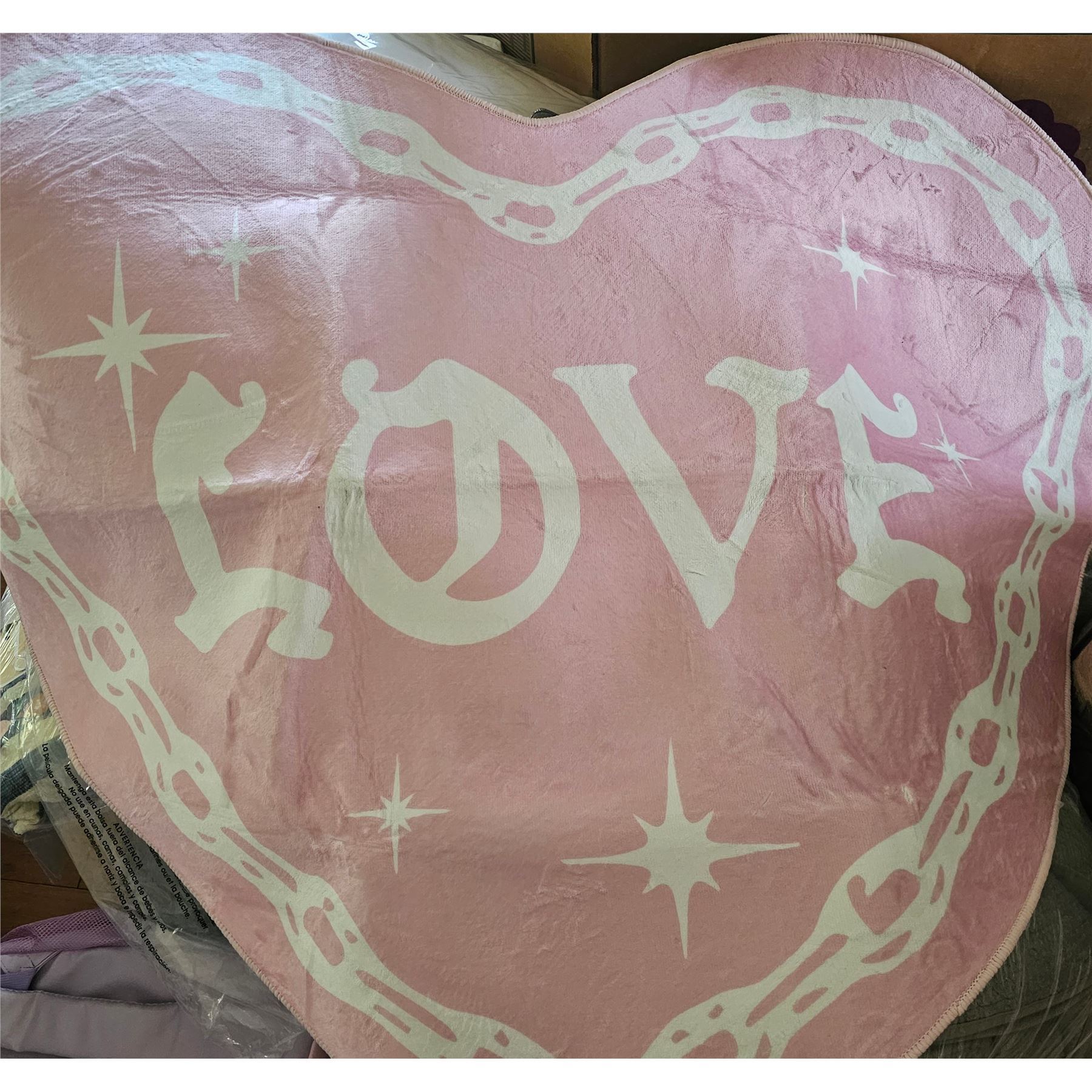 Soft pink fleece with "LOVE" design, ideal for gift or decor, new condition.