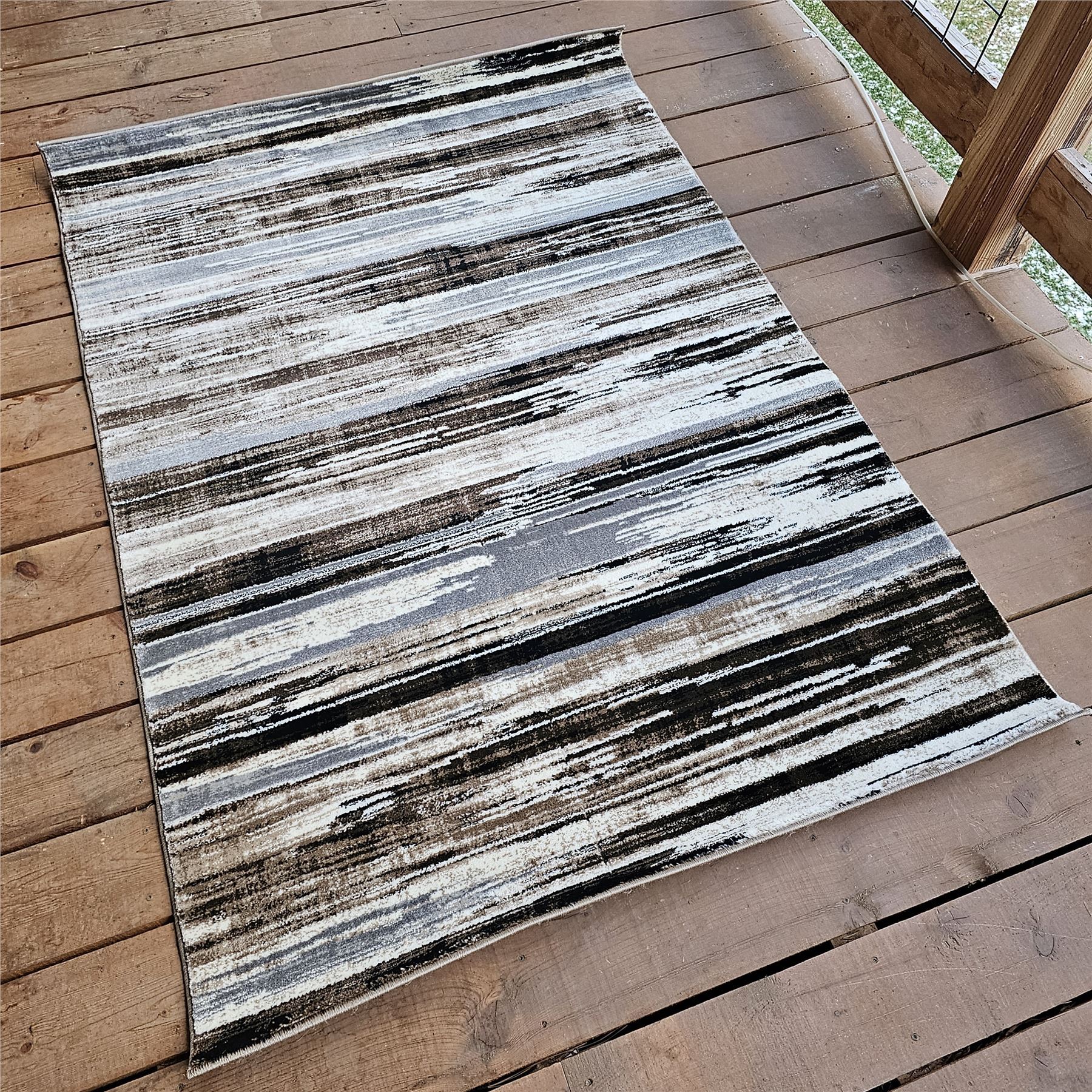 Contemporary design in neutral tones, suitable for indoor use, new condition. 5 x 7 feet, stain-resistant material.