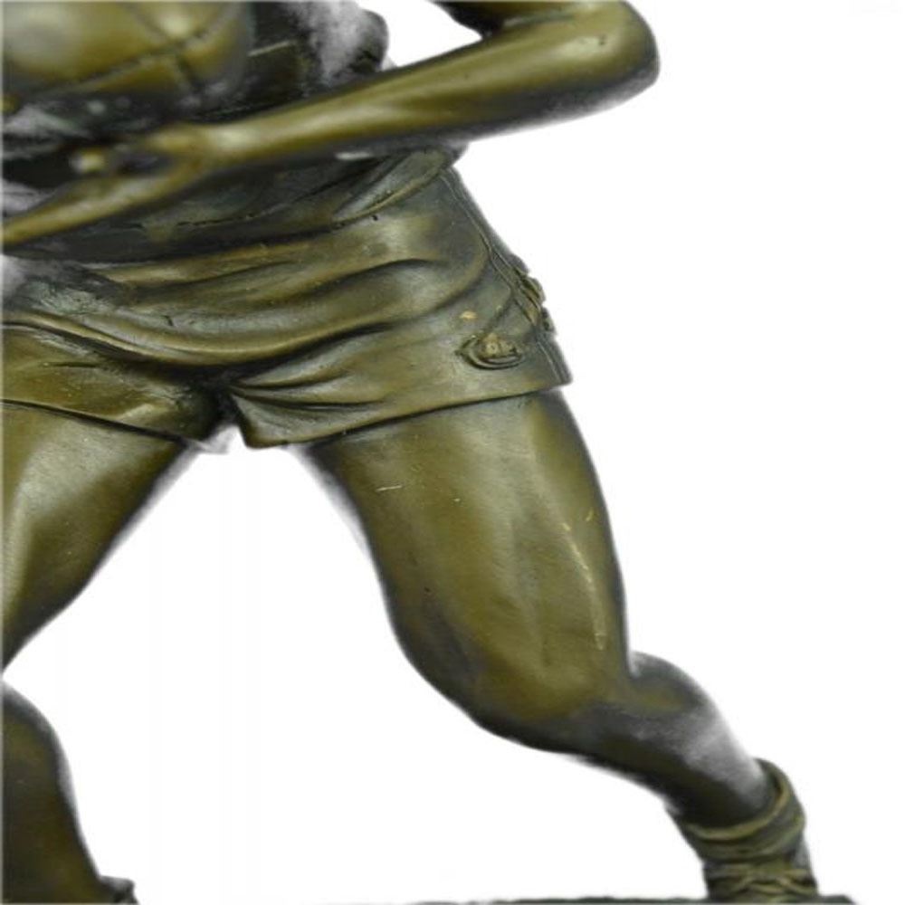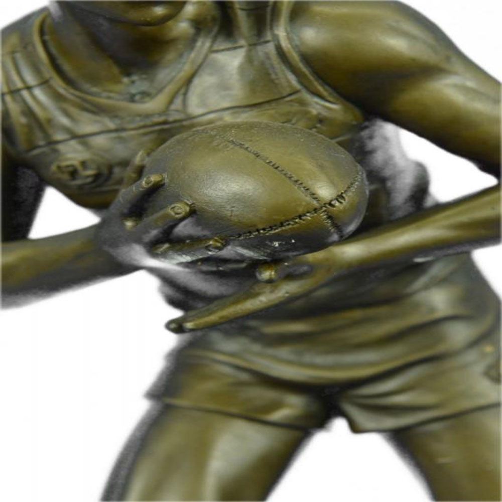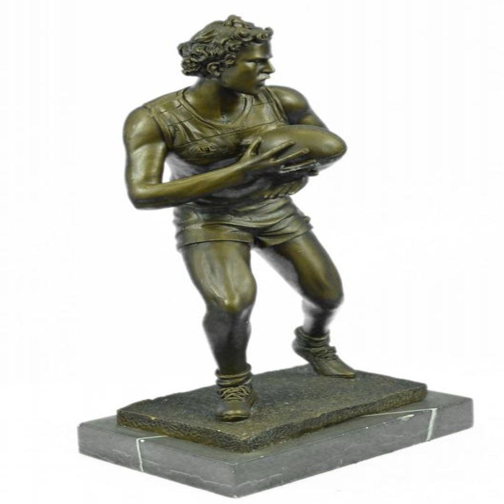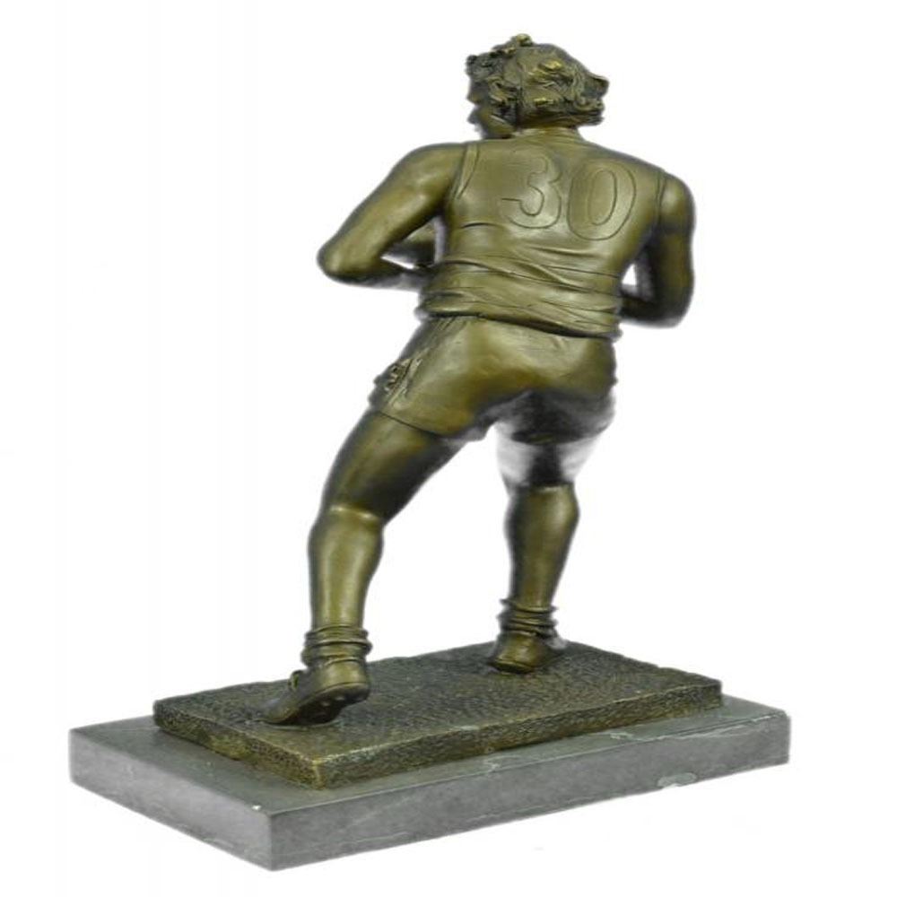 A muscular Rugby player runs for the end field, trying to skip the yards and avoid being tackled. His powerful legs ache as he sprints and dodges. He Kicked the ball under him protectively. Every once in a while he glances over his shoulder to see how close his opponents are. He eyes the white touch down line. He can hear another player barreling down on him. He glances at his teammate and prepares to hand the ball over, sacrificing himself for the win. This brown patina Sculpture was cast using the Lost Wax Method and mounted on a marble base. Dimensions: Height 15 X Width 8 inches. Weight: 12 LBS.