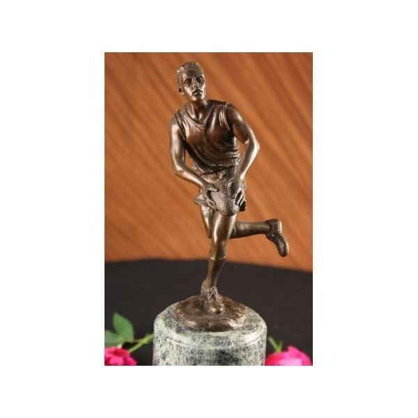 A muscular football player runs for the end field, trying to skip the yards and avoid being tackled. His powerful legs ache as he sprints and dodges. He holds the ball under his protectively. Every once in a while he glances over his shoulder to see how close his opponents are. he eyes the white touchdown line. He can hear another player barreling down on him. He glances to his teammate and prepares to hand the ball over, sacrificing himself for the win. This brown patina sculpture was cast using the lost wax method and mounted on a green marble. Bronze dimensions with marble base: Height 12 X Width 5 inches. Weight: 7 lbs. Please Note: This is a reproduction bronze sculpture from the original molded and signed. This featured bronze sculpture is a recast after the original, and has been done recently. This 100% bronze sculpture is an abstract piece certain to be a conversation piece.Please Note: This is a reproduction bronze sculpture from the original molded and signed. This featured bronze sculpture is a recast after the original, and has been done recently. This 100% bronze sculpture is an abstract piece certain to be a conversation piece.