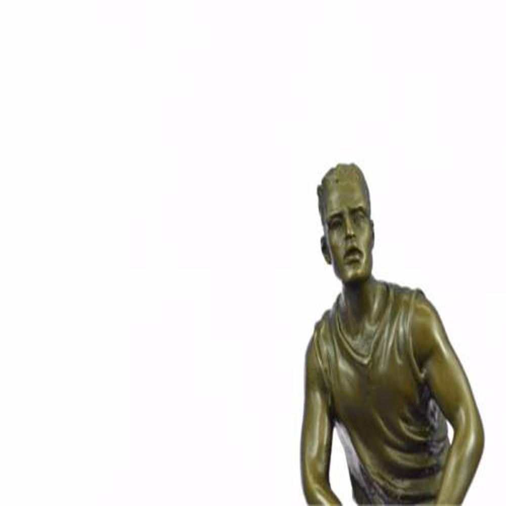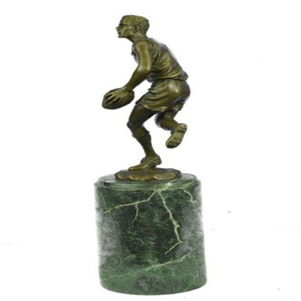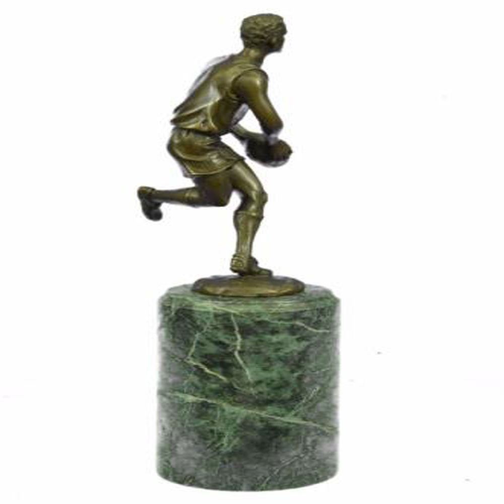 A muscular football player runs for the end field, trying to skip the yards and avoid being tackled. His powerful legs ache as he sprints and dodges. He holds the ball under him protectively. Every once in a while he glances over his shoulder to see how close his opponents are. He eyes the white touch down line. He can hear another player barreling down on him. He glances to his teammate and prepares to hand the ball over, sacrificing himself for the win. This brown patina Sculpture was cast using the Lost Wax Method and mounted on a marble base. Dimensions: Height 12 X Width 5 inches. Weight: 7 LBS.