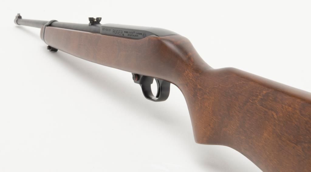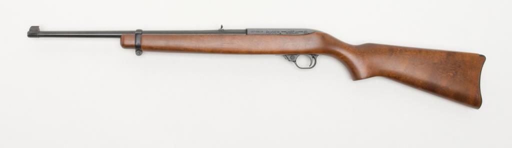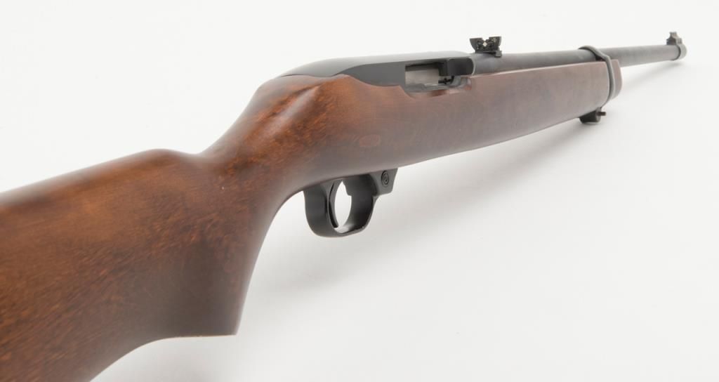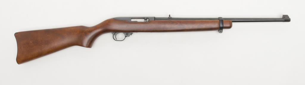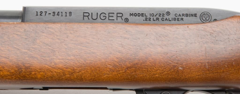 Ruger 10/22, #127-34118, 22 LR cal., 18 1/2" barrel, birch hardwood stock. Rifle is in fine condition overall, showing minimal wear. Action is tight, bore is mint. Stock shows light scratches from storage. Finish retains 97%original blue with minimal mars. magazine included. (MODERN) Est. $125-250.
