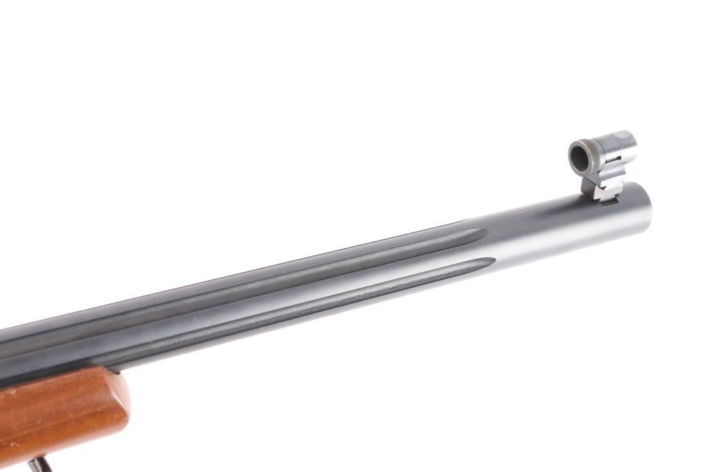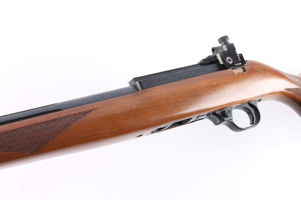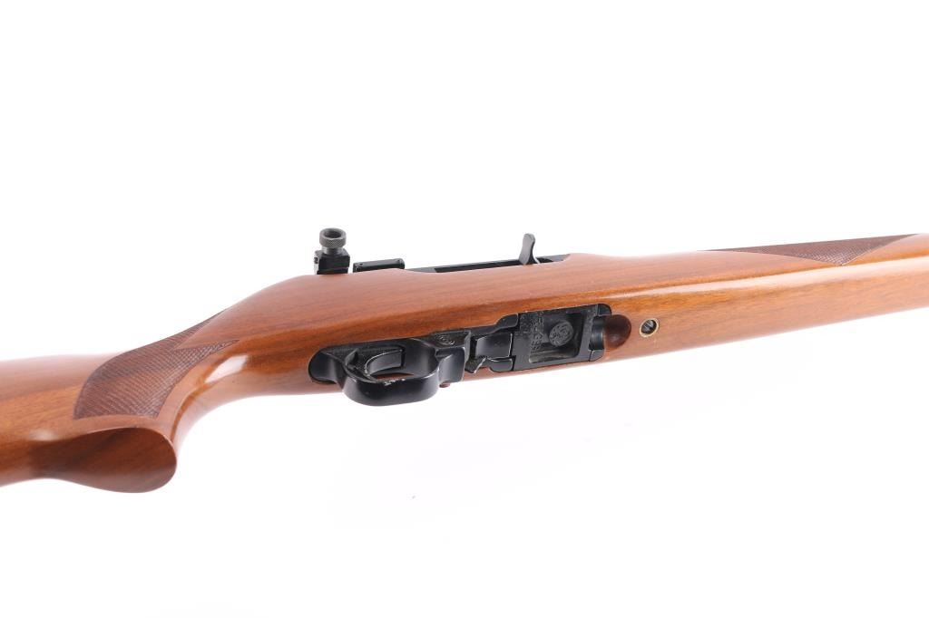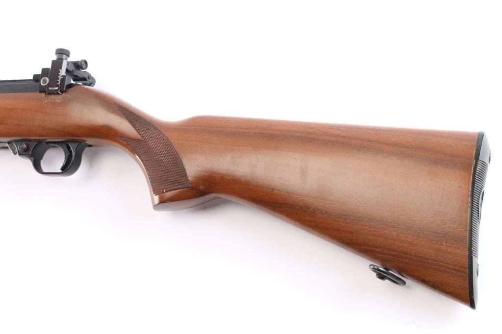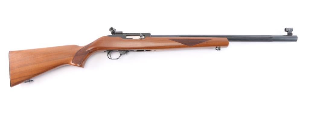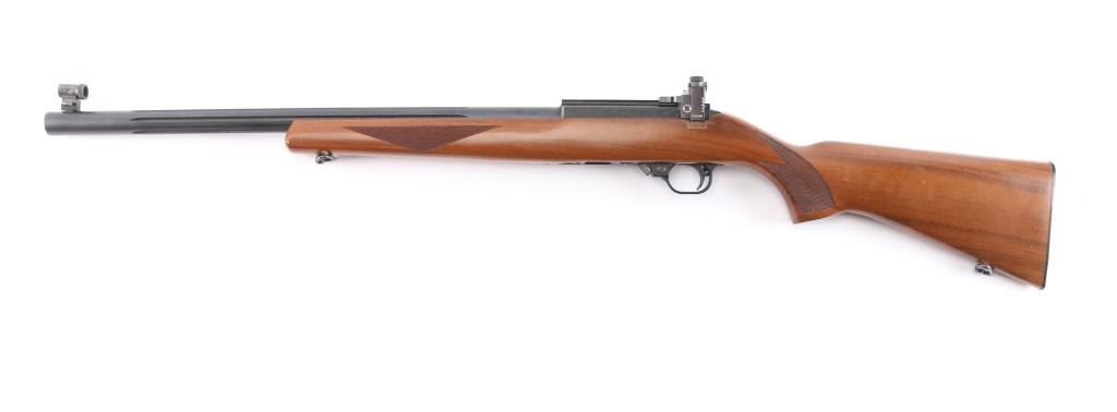 Upgraded American made semi-automatic carbine, blued finish, 20" Butler Creek heavy. fluted barrel installed, matte finish, globe/post front sight, Williams adjustable peep sight installed on the left receiver, one peice walnut stock with checkered panels, sling swivels and factory buttplate. Bore is excellent/bright, wood and finish are excellent. Manufactured 1990.
