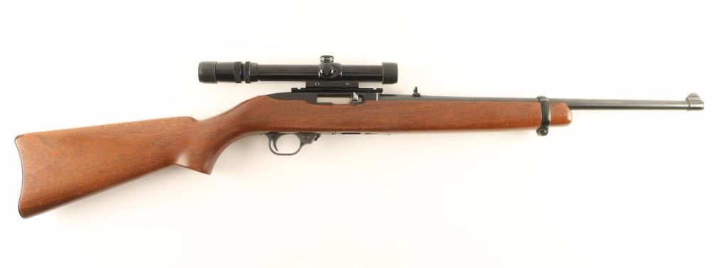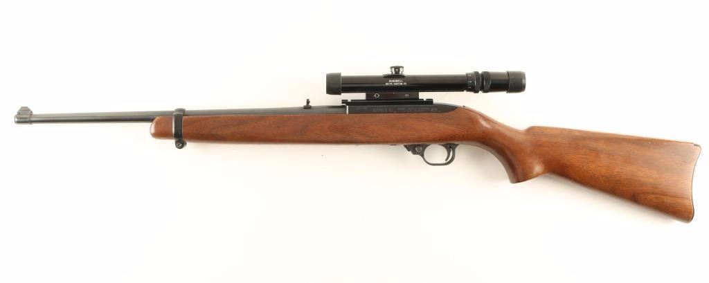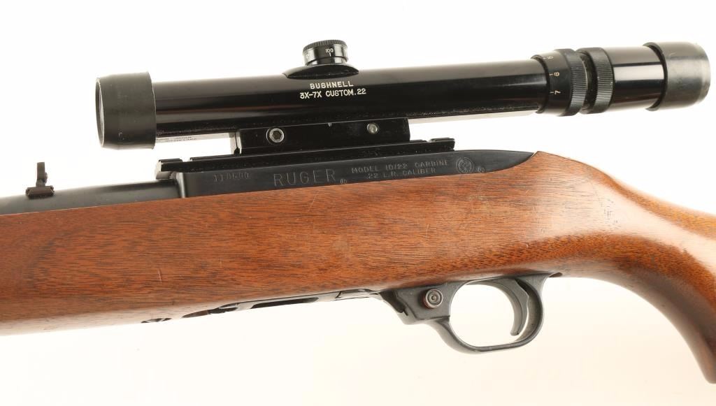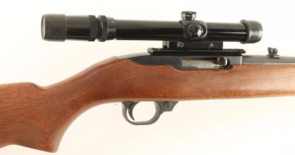 Early magazine fed semi-automatic sporting rifle chambered in .22 Long Rifle, circa 1967. Features a blued finish, 18.5" barrel, blade front sight with brass bead, adjustable rear sight, Bushnell 3x-7xscope, 10 round factory magazine, push button safety, bolt hold open lever, smooth trigger and one piece smooth pistol grip shoulder stock with metal buttplate. Rifle exhibits 91%+ of it's original blued finish with wear on the right side of the barrel forward of the barrel band and a dulling trigger assembly. Action is smooth, bore is mirror bright and wood stock is near fine with some small blemishes. Condition is very good. ***Modern Firearm***