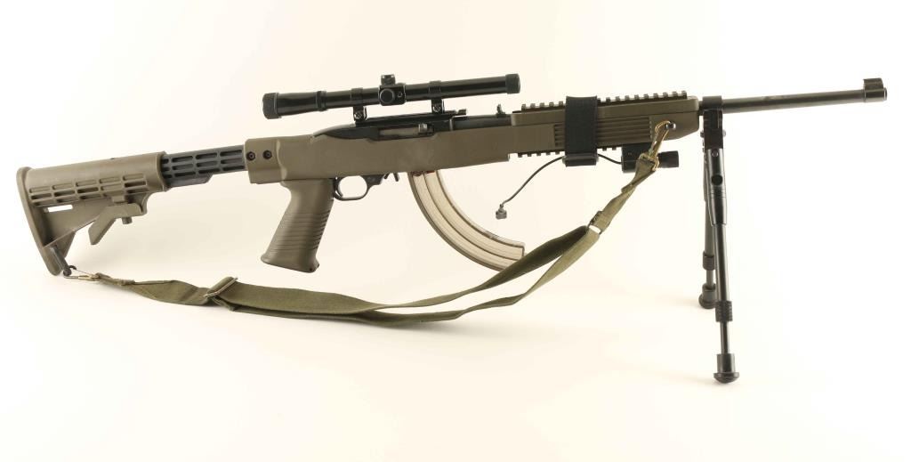 Modified blowback operated semi-automatic rifle chambered in .22 Long Rifle, manufactured circa 1982. Features a blued 18.5" tapered barrel, dovetailed blade front sight with brass bead, flip-up adjustable rear sight, Crosman 4x 15mm scope, adjustable bi-pod attached to the barrel, laser light with tape switch installed on the underside of the forend, smooth trigger, push button safety, bolt hold open lever, 50 round Ram-Line magazine, smooth charging handle, black finished alloy receiver, green canvas sling and olive drab green Tapco stock set with accessory rail on the handguard, SAW style grip & six-position telescoping shoulder stock. Rifle exhibits approximately 80% of it's original finish showing slide wear on the barrel from the rotating bipod, scattered scratches and areas of pin prick pitting & cleaning on the barrel. Action is smooth, the bore is pristine, optics are clear and the synthetic stocks are fine. Condition is NRA Good. ***Modern Firearm***
