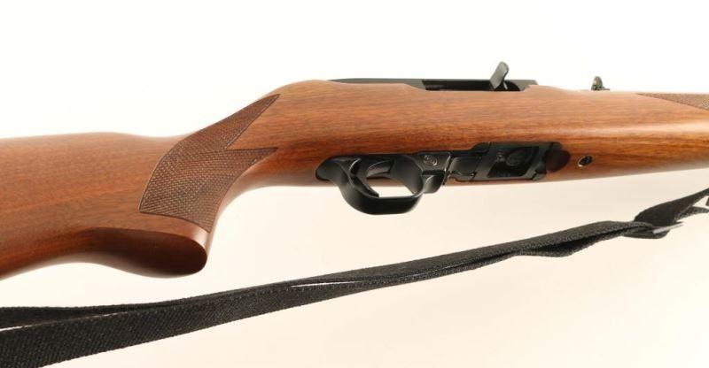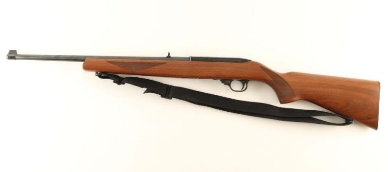 American made magazine fed semi-automatic sporting rifle chambered in .22 Long Rifle, circa 1987. Features a blued 18.5" tapered barrel, dovetailed blade front sight with brass bead, adjustable flip-up rear sight, drilled & tapped alloy receiver with matte black finish, smooth trigger, push button safety, factory 10 round magazine, bolt hold open lever, black nylon sling and one-piece checkered walnut pistol grip shoulder stock with factory black synthetic buttplate. Rifle exhibits approximately 99% of it's original finish showing some minor handling marks/losses. Action is smooth, bore is excellent, and wood stock is near fine showing a single blemish on the right side behind the rear sight. Condition is NRA excellent. ***Modern Firearm***