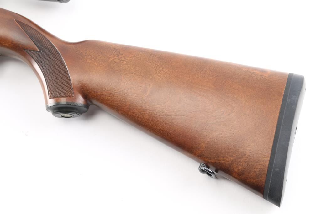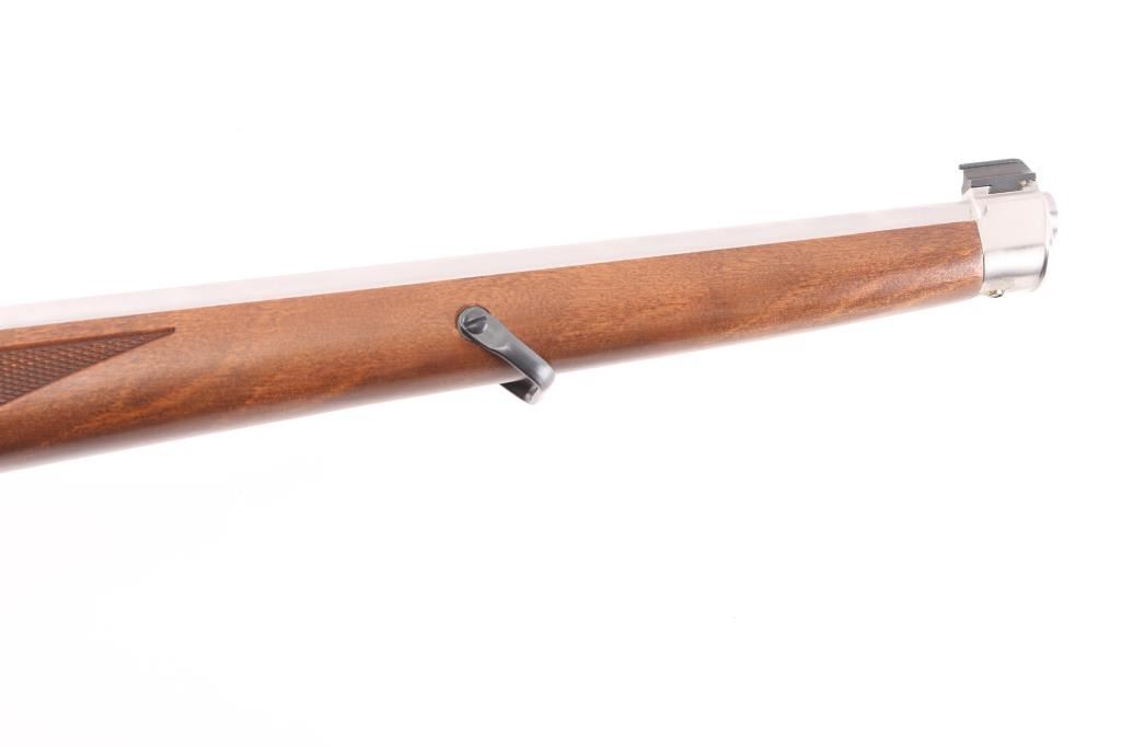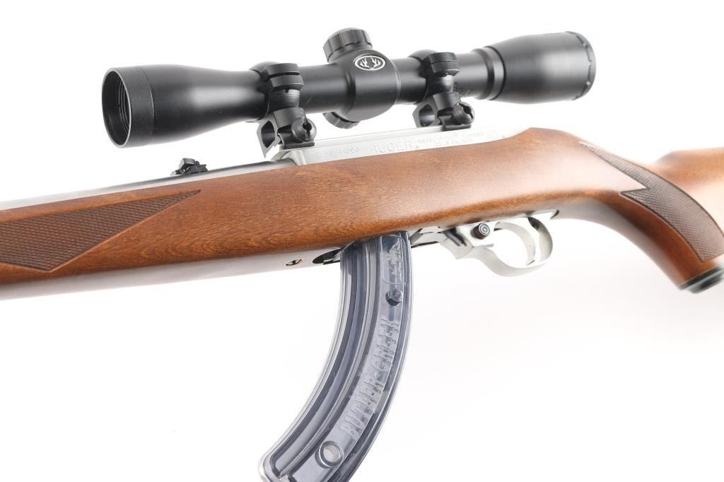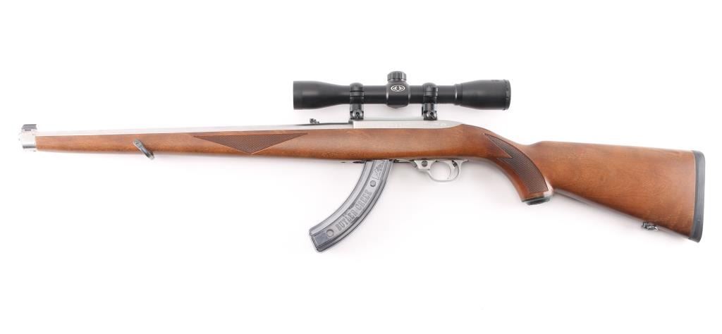 Magazine fed semi-automatic sporting rifle chambered in .22 Long Rifle, manufactured circa 1996. Features a stainless steel 18.5" tapered barrel, dovetailed blade front sight with brass bead, flip-up adjustable rear sight, Bushnell Sportsman 4x32 Rifle Scope, fine cross reticle, clear optics. Three Butler creek clear plastic 25 rd magazines, push button safety, alloy receiver, European style sling swivels, and a checkered full-length Mannlicher-style wood stock with metal forend cap, grip cap & factory recoil pad. Rifle exhibits only minor handling marks with no major wear observed. Action is smooth, the bore is pristine and wood stock is fine with minimal blemishes.Condition is near NRA Perfect. Modern Firearm